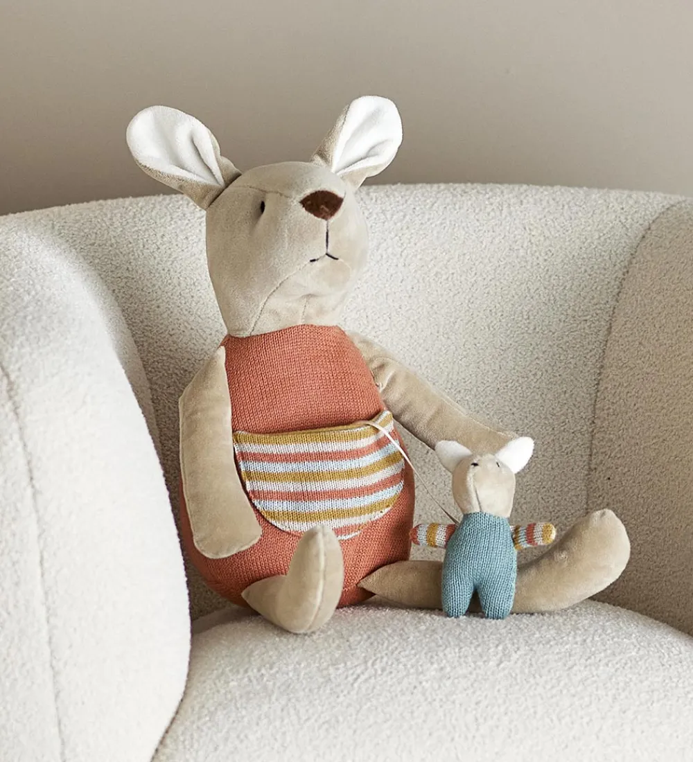 Flot Bloomingville dukke formet som en kænguru med en orange, strikket trøje på. Fortil sidder der en lille lomme med en sød kænguruunge. Denne søde dukke er ideel til leg og giver timevis af underholdning.