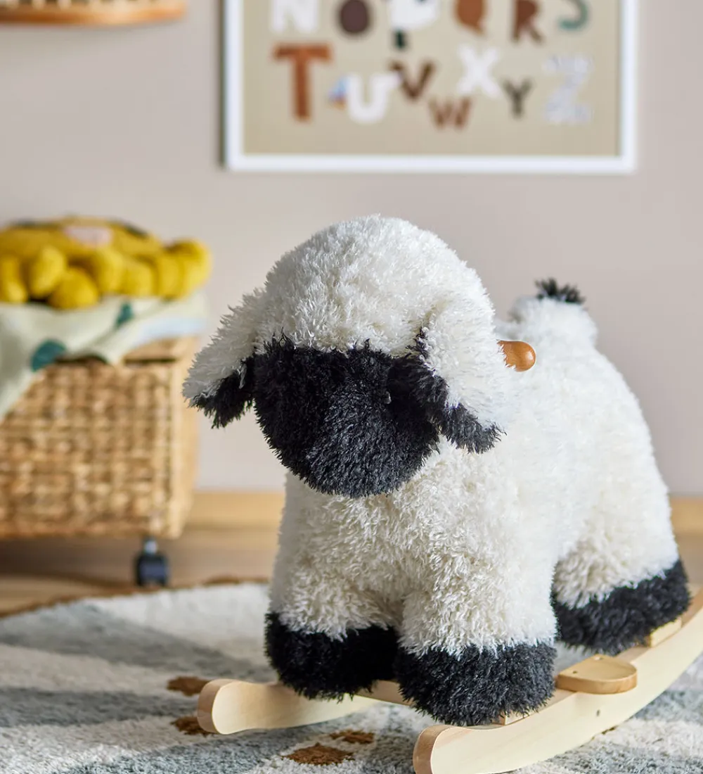Sød Bloomingville Mini gyngehest med form som et får. Gyngehesten er hvidt med sort ansigt og hove.