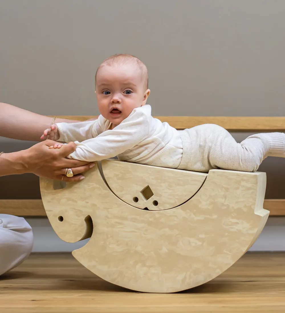 Når man vender kyllingen om, bliver den til en sjov vippe, som både de helt små, de større og de helt store børn kan bruge mange timer på at lege med. Det mindste barn kan vippe lige så stille, mens de større børn kan prøve at holde balancen på maven, numsen eller på fødderne.