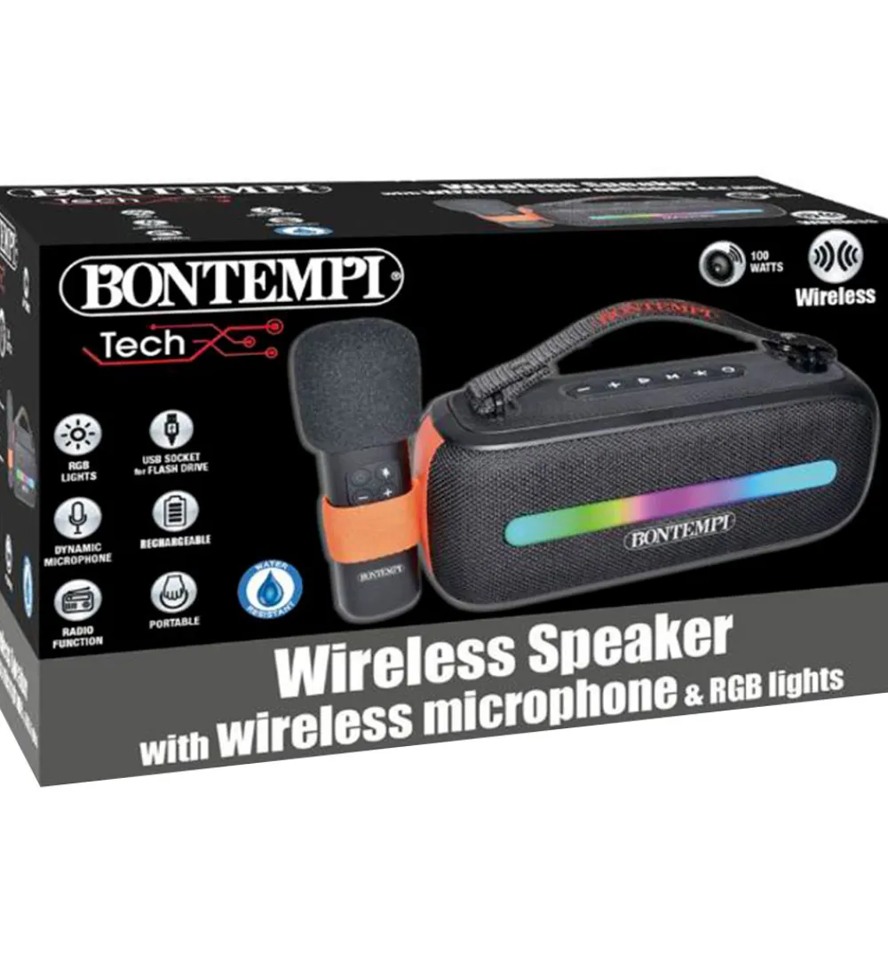 Bontempi højtaleren er trådløs, og den fylder ikke meget, så den er nem at have med på farten. Højtaleren har et genopladeligt litium-batteri, som tilsluttes et usb-stik som medfølger, og den har en kapacitet på 140 W. Der medfølger en trådløs mikrofon, så man kan synge med på de sange, den afspiller, og fortil er der et lyspanel, som kan lyse op i alle regnbuens farver. I toppen sidder der en rem, som kan bruges som håndtag, når man bærer rundt på højtaleren.