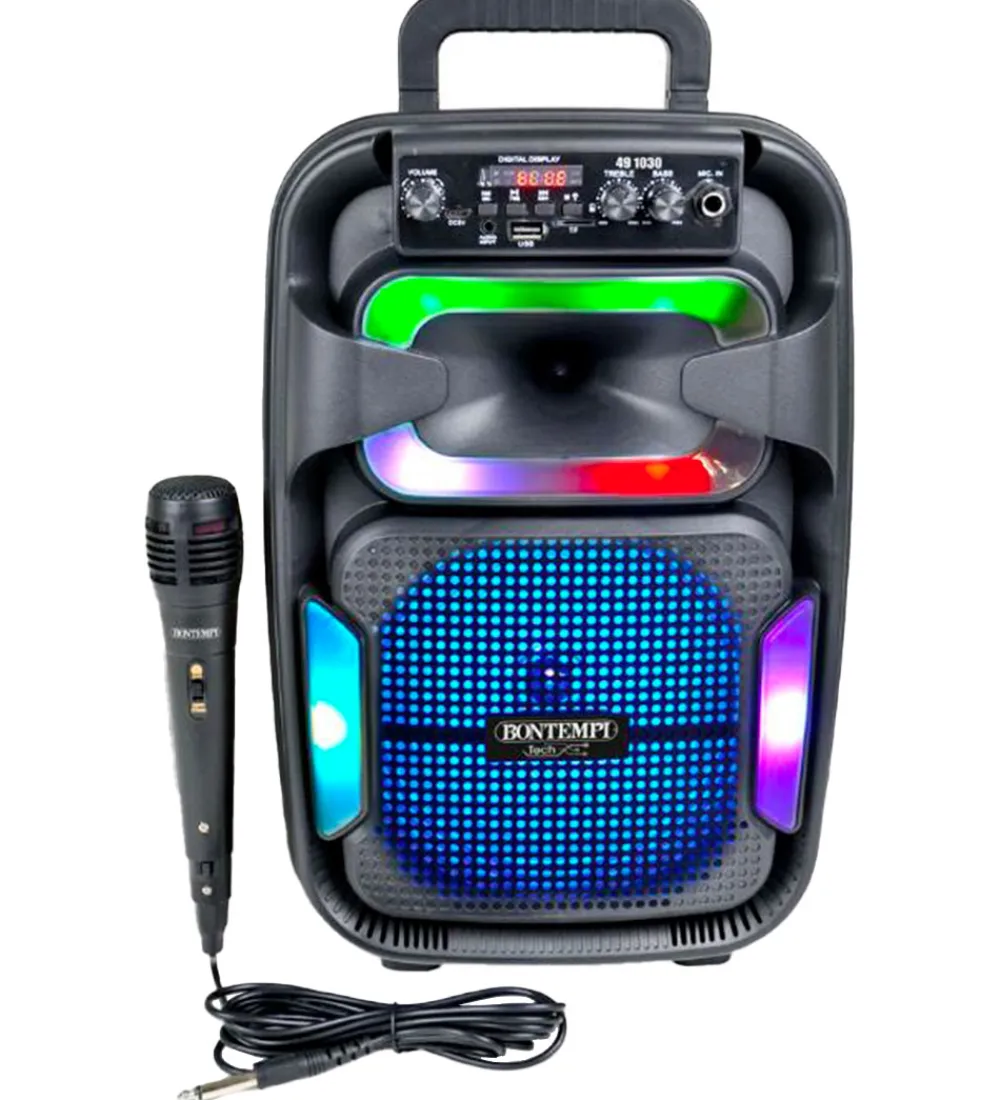 Bontempi højtaleren er trådløs, og den er let at flytte rundt på, så man kan have den med til stranden, parken og lignende. Højtaleren har et genopladeligt litium-batteri, som tilsluttes et usb-stik som medfølger, og den har en kapacitet på 120 W. Der medfølger en mikrofon, så man kan synge med på de sange, den afspiller, og fortil er der lyspaneler, som kan lyse op i alle regnbuens farver. Der er også et betjeningspanel med et praktisk display.