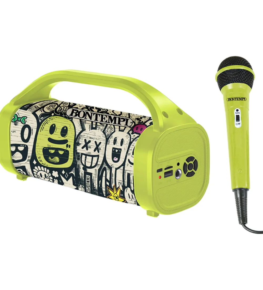 Sej Bontempi højttaler i neongrøn med et smart graffitiprint.