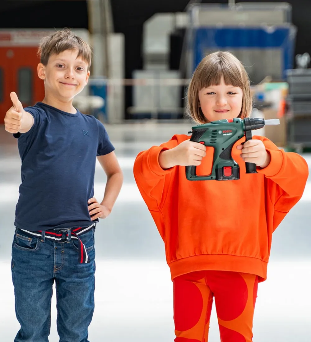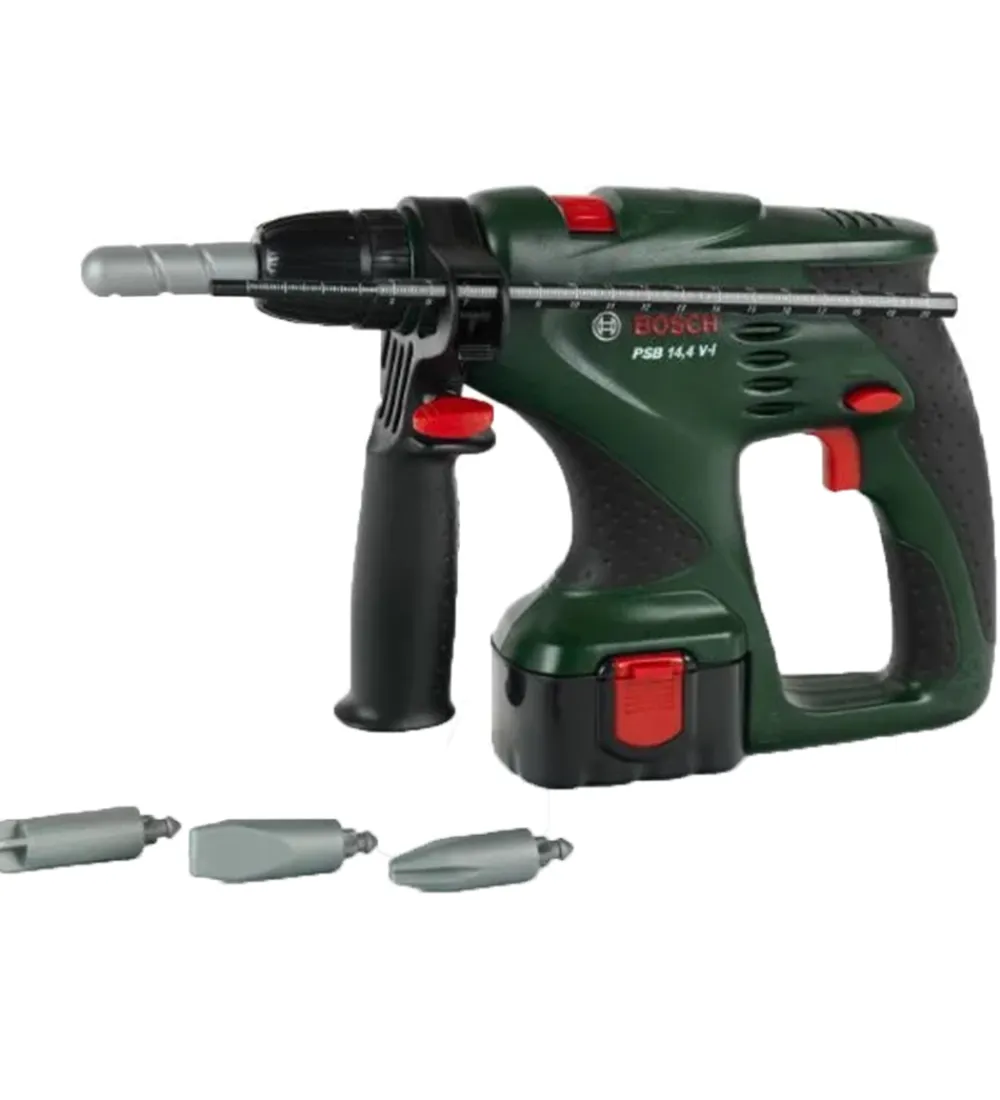 Bosch Mini legetøjs-slagboremaskine har et realistisk design, så den lille medhjælper med glæde vil hjælpe med at bore huller. Slagboremaskinen roterer, lyser og afgiver lydeffekter, så den til forveksling ligner og lyder som mors eller fars.