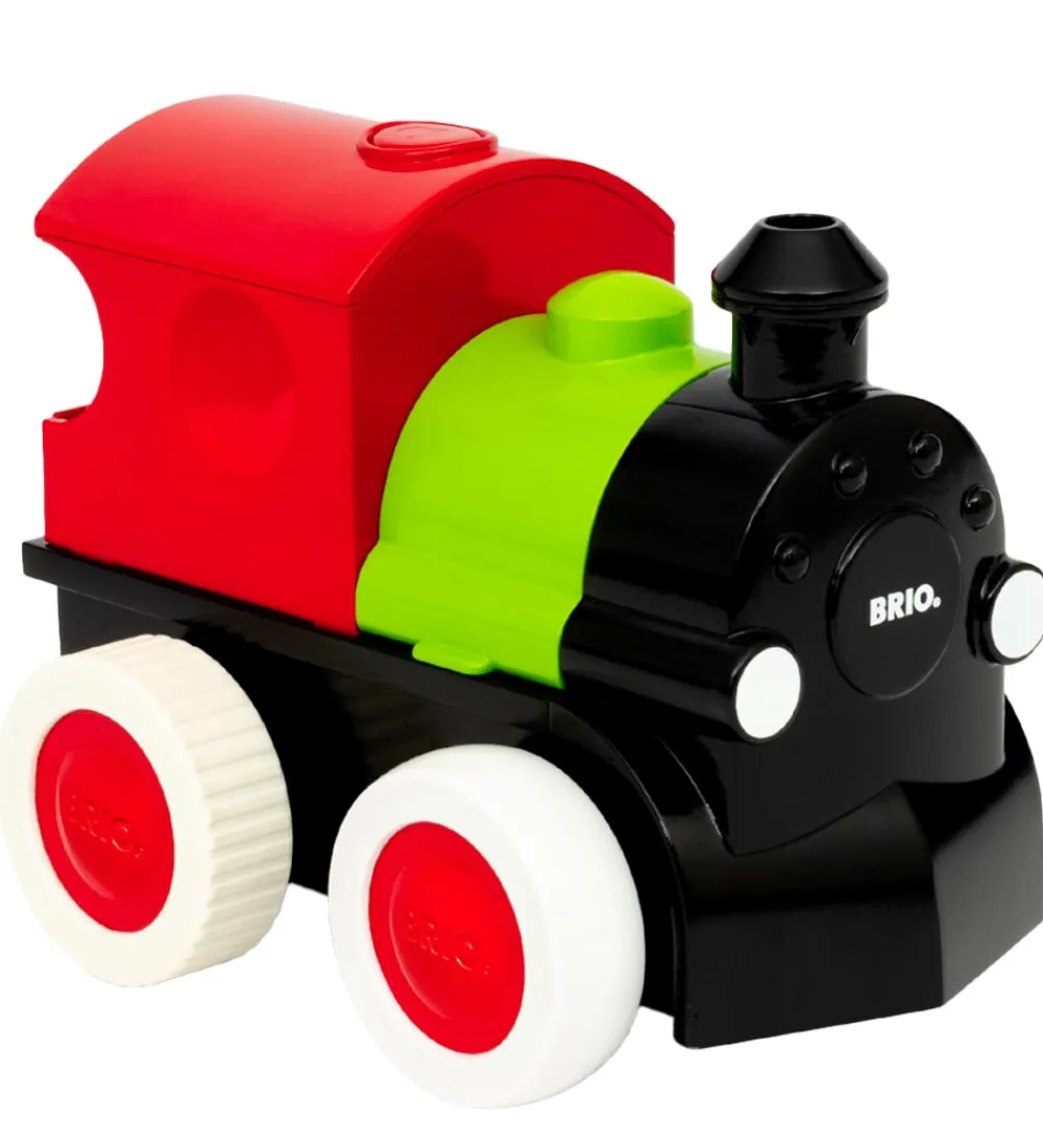 BRIO toget kører selv, når du trykker på knappen i toppen, og ud af skorstenen kommer der berøringssikker damp. Nu er det bare med at følge efter toget og få det til at køre igen.