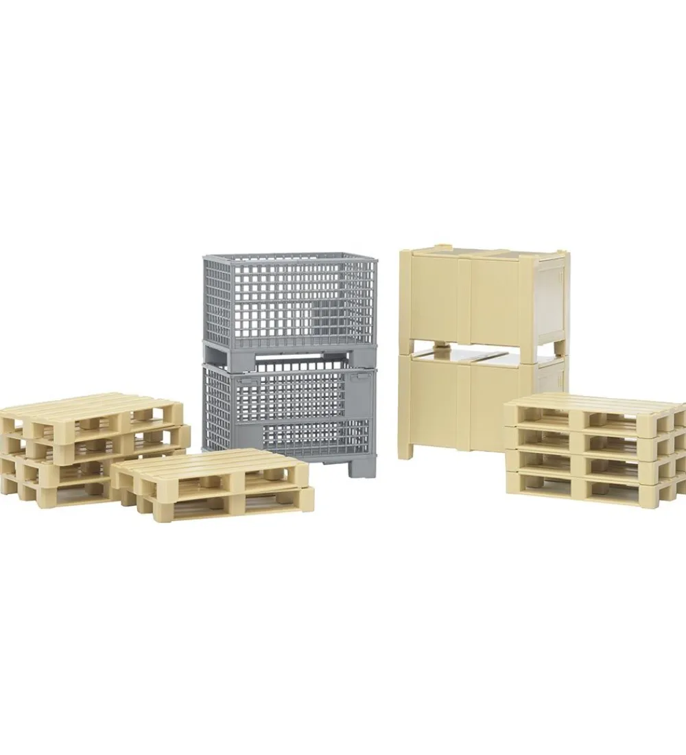 Smart Bruder tilbehør i form af to gitterkasser, to kasser og ti paller med inspiration fra fragt og logistik-verdenen. Tilbehøret er i et metal- og træfarvet farvetema og fremstår fuldstændig som den ægte vare i størrelsesforholdet 1:16.