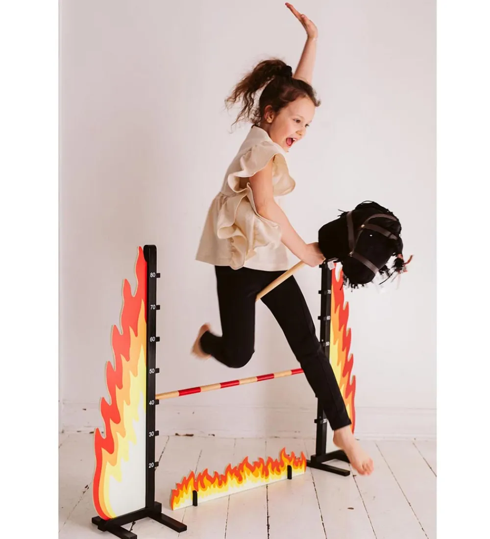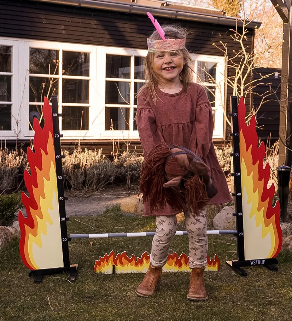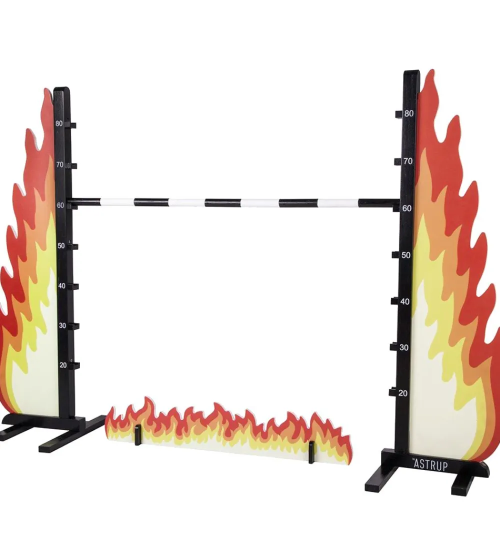 Sjovt by ASTRUP spring til kæphest i træ som ligner flammer, med en bom i hvid træ med sorte striber. Der medfølger en lille flamme, som kan placeres under bommen.