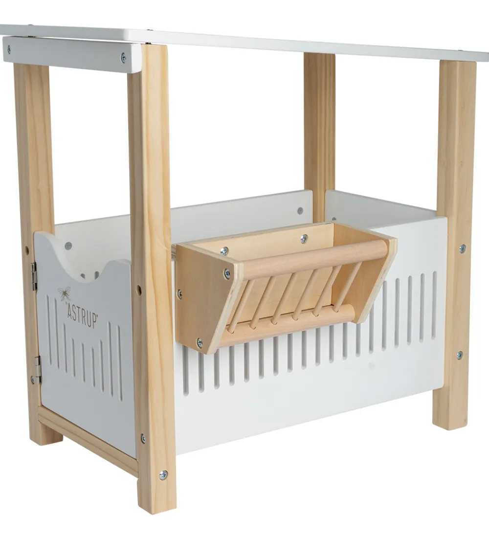 by Astrup hestestalden har en firkantet facon med et tag og en dør som kan åbnes. På den ene side er der et udhæng på ydersiden, hvor man kan placere mad til hesten. Hestestalden passer til en by Astrups krammepony på 30 cm.