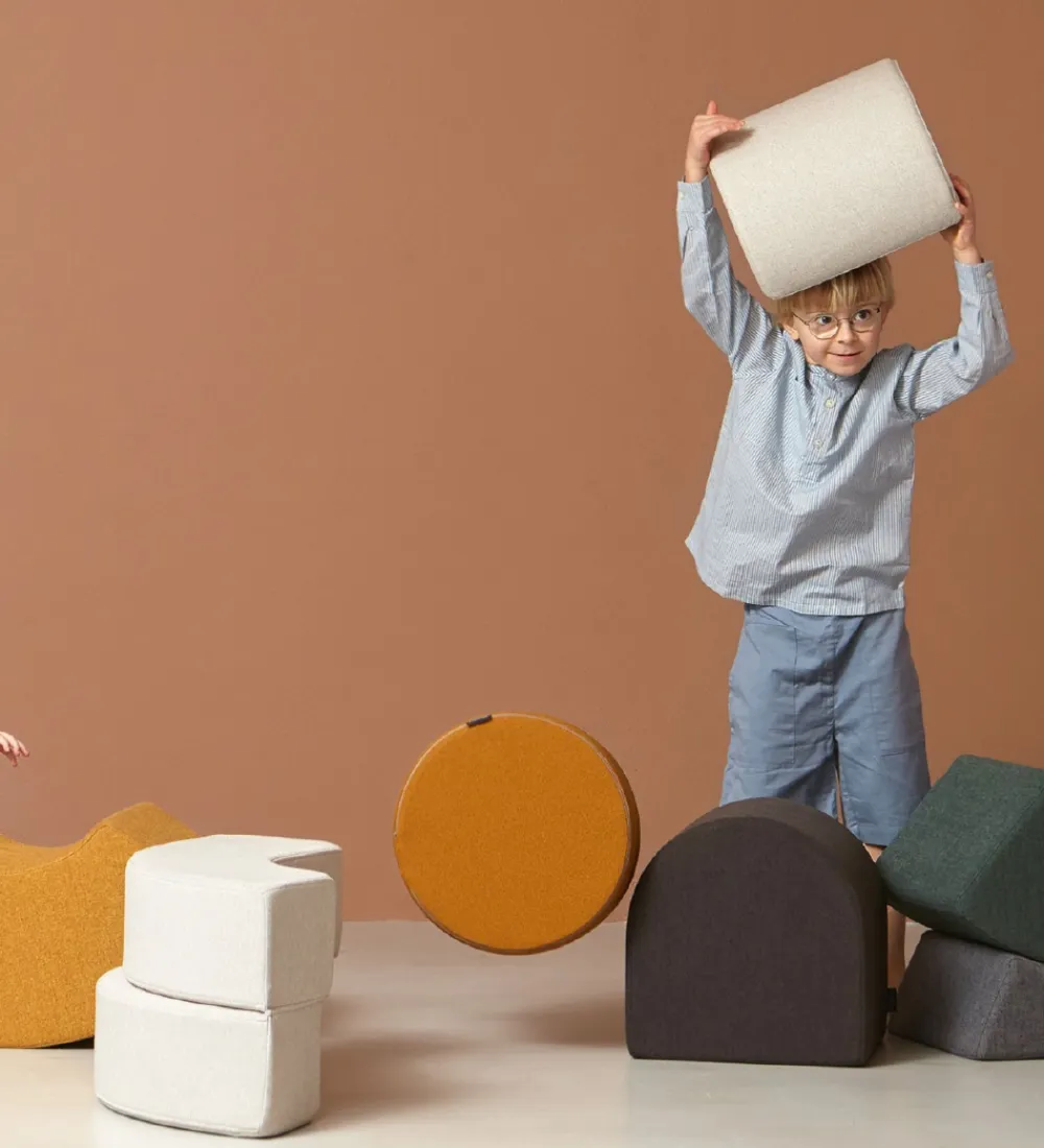 by Klipklap tumlemøblet har en aflang, firkantet form med en flad bund, og i toppen er der en rundet fordybning. Det lilla barn kan bruge det som en sjov forhindring, og tumlingen kan bruge den som en puf eller en skammel til at komme op i sofaen.