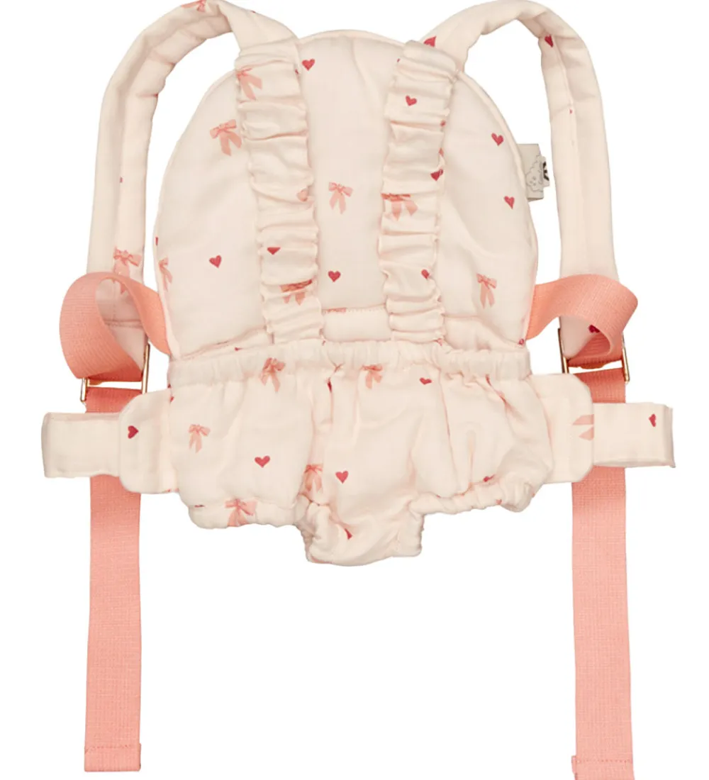 Fin Cam Cam Copenhagen bæresele til dukker i lys rosa et alloverprint af rosa sløjfer og hjerter og rosa remme.