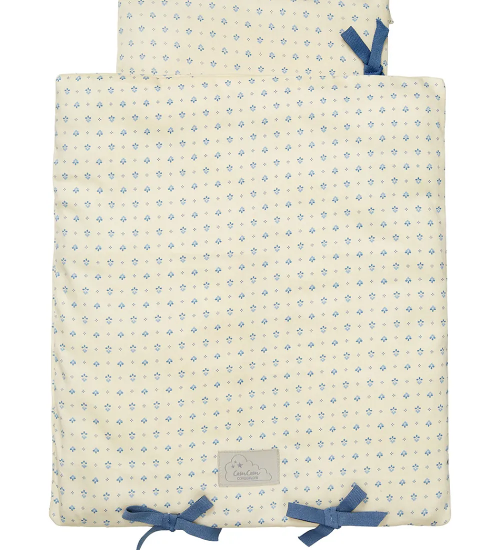 Fint Cam Cam Copenhagen dukkesengetøj i beige med et alloverprint af fine, små blomster i blå nuancer og med blå sløjfer.