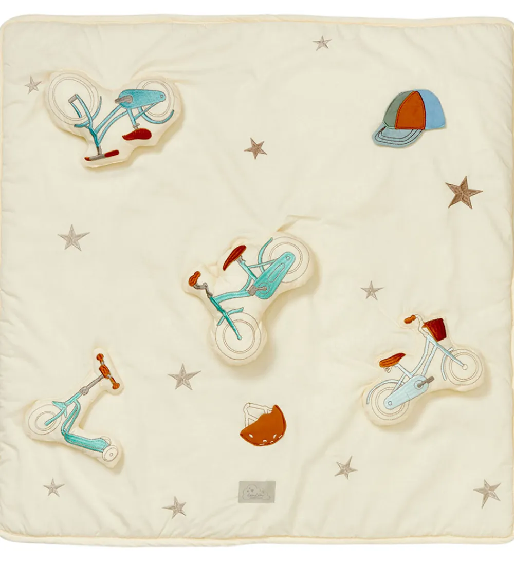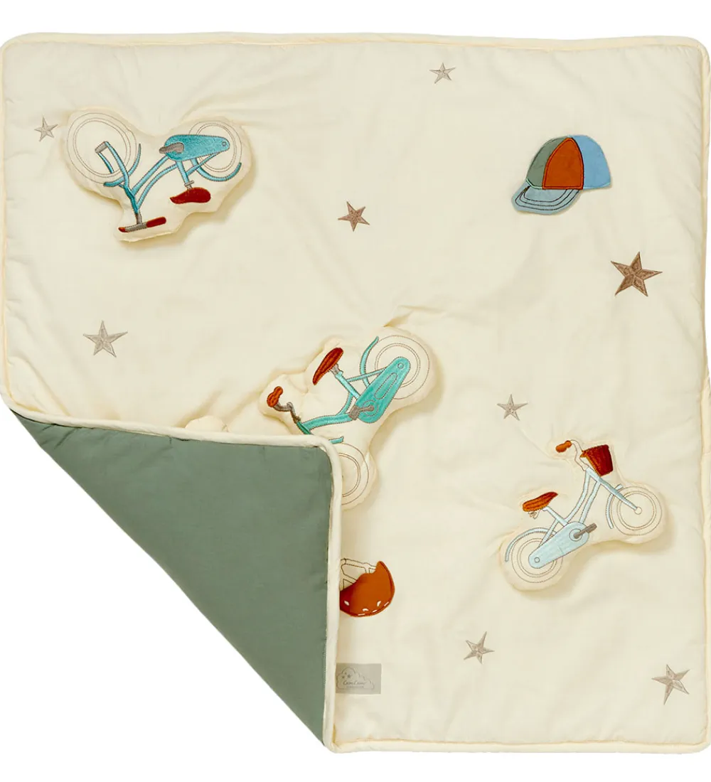 Fint Cam Cam Copenhagen aktivitetstæppe beige med et alloverprint af fine, små cykler i blå, grønne og brune nuancer på den ene side og ensaret, støvet grøn på den anden.