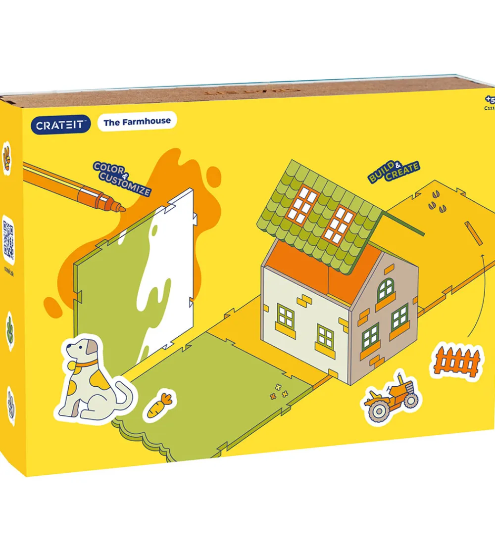 Crateit kreasættet består af i alt 1 byg-selv hus, 25 hegn, to marker og 12 figurer, heriblandt traktorer, bondegårdsdyr og tilbehør, der på smart vis kan sættes sammen. Crateit kreasættet er lavet af umalet træ, som kan farvelægges med alle slags tuscher, maling og farveblyanter.