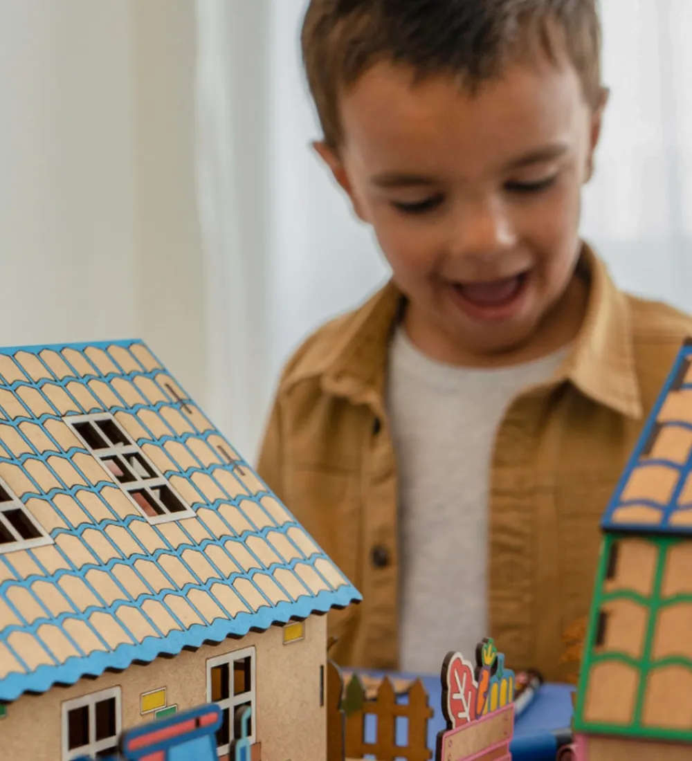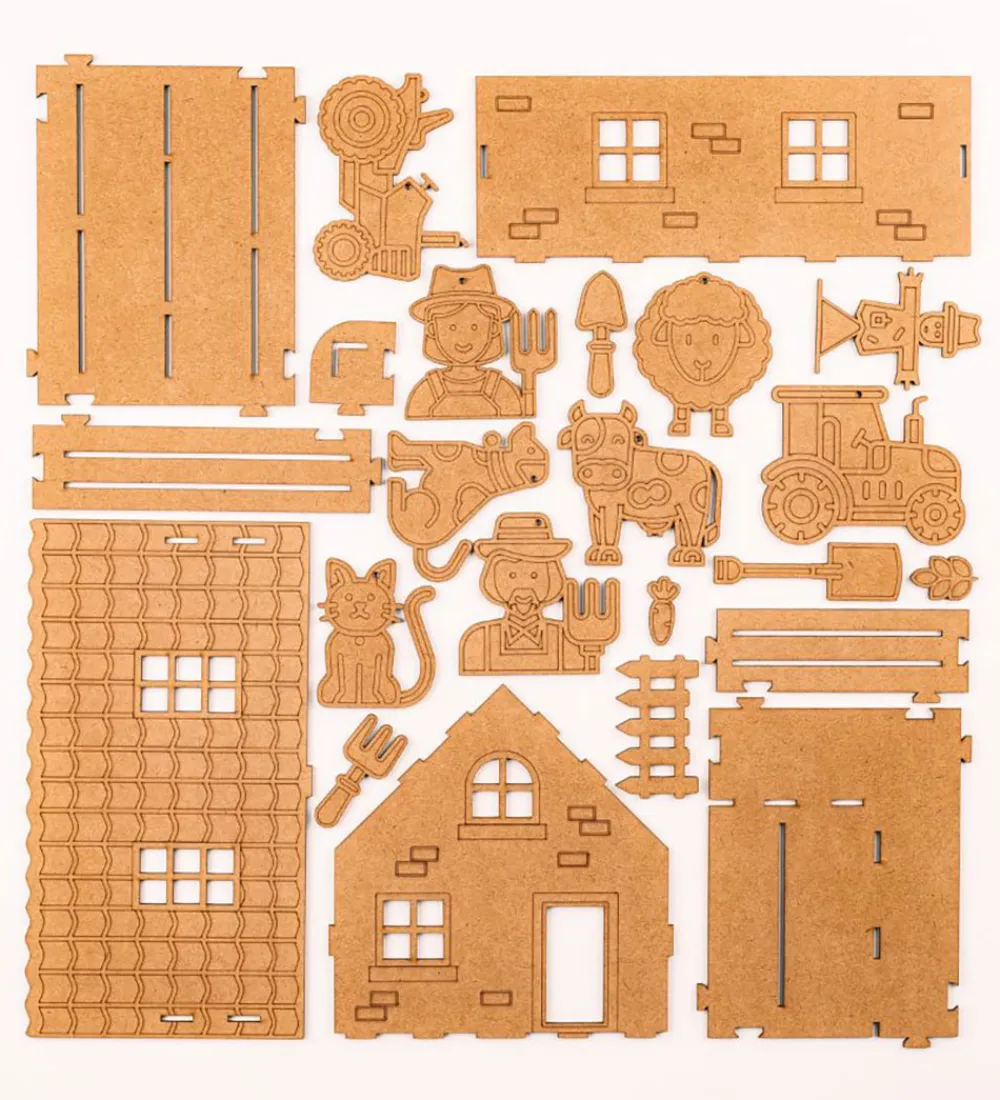 Hyggeligt Crateit kreatsæt i form af et bondehus og fine figurer af HDF-træplader i et bondehuset-tema.