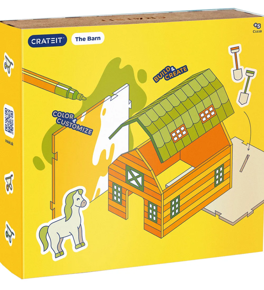 Crateit kreasættet består af i alt 1 byg-selv stald, 4 hegn og 7 figurer, heriblandt traktorer, bondegårdsdyr og tilbehør, der på smart vis kan sættes sammen. Crateit kreasættet er lavet af umalet træ, som kan farvelægges med alle slags tuscher, maling og farveblyanter.