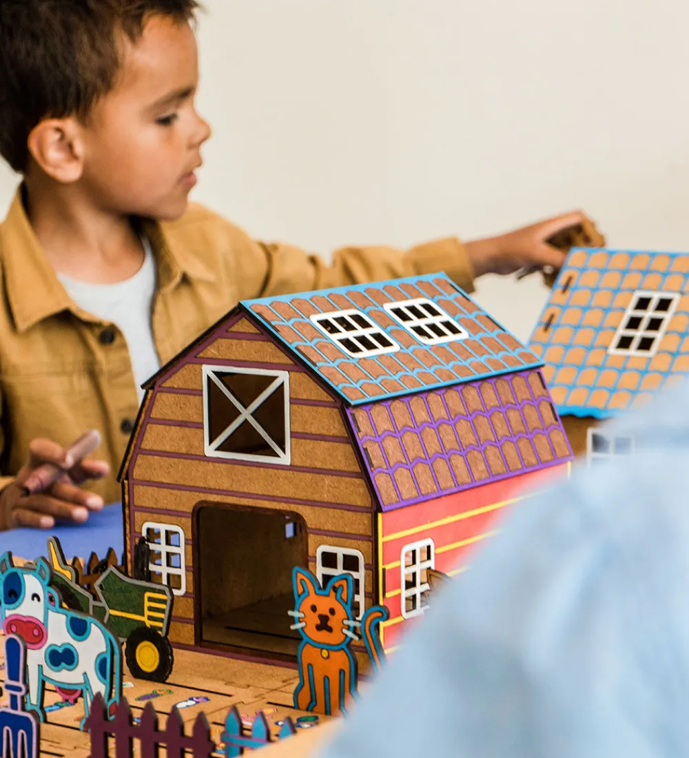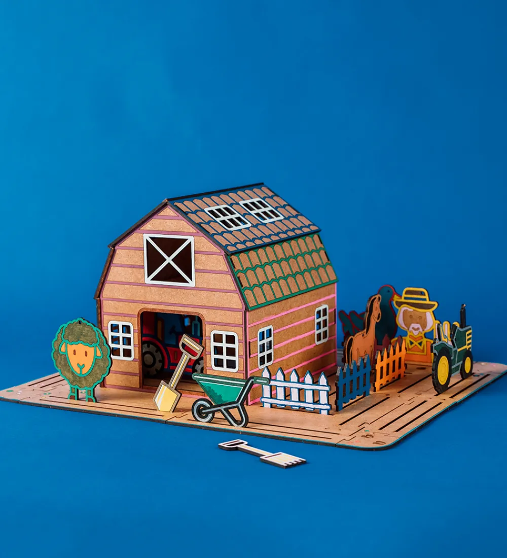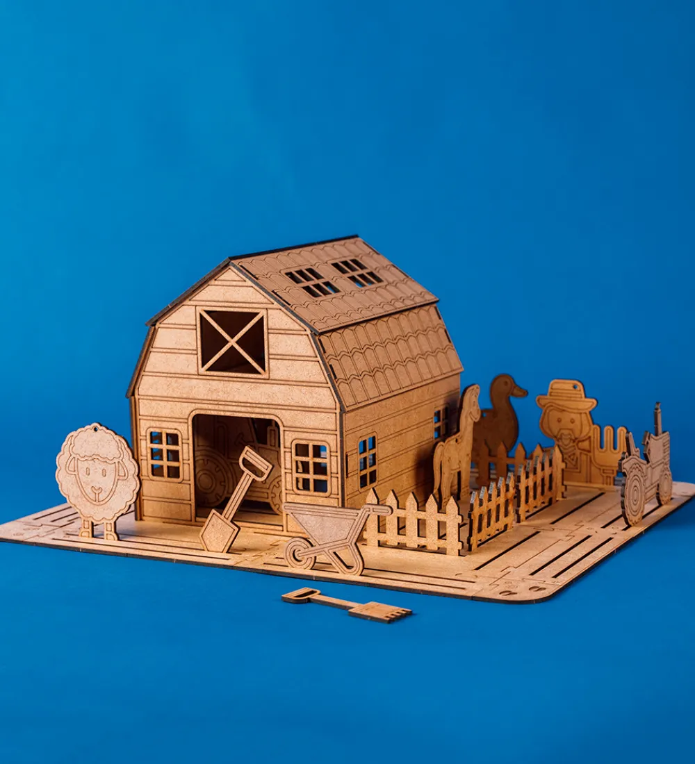 Hyggeligt Crateit kreatsæt i form af en stald og fine figurer af HDF-træplader i et livet i stalden-tema.