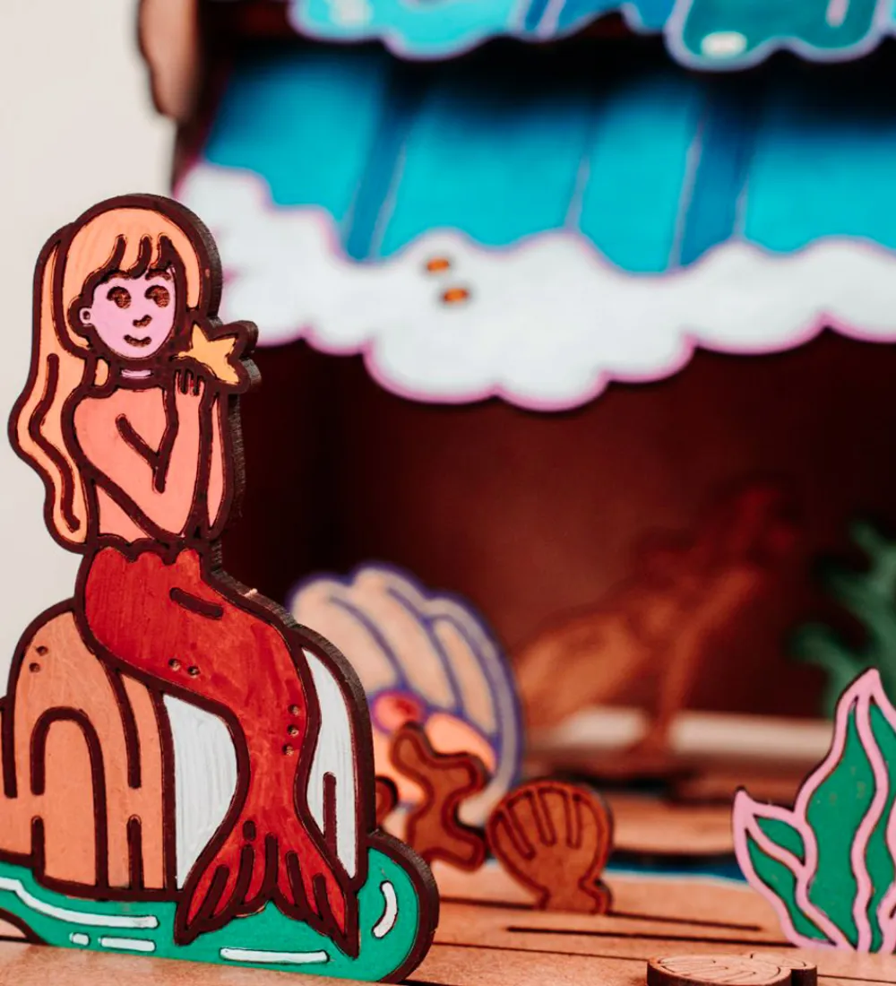Hyggeligt Crateit kreasæt, hvor der skal bygges og farvelægges en muslingekyst med havfruer i HDF-træplader.