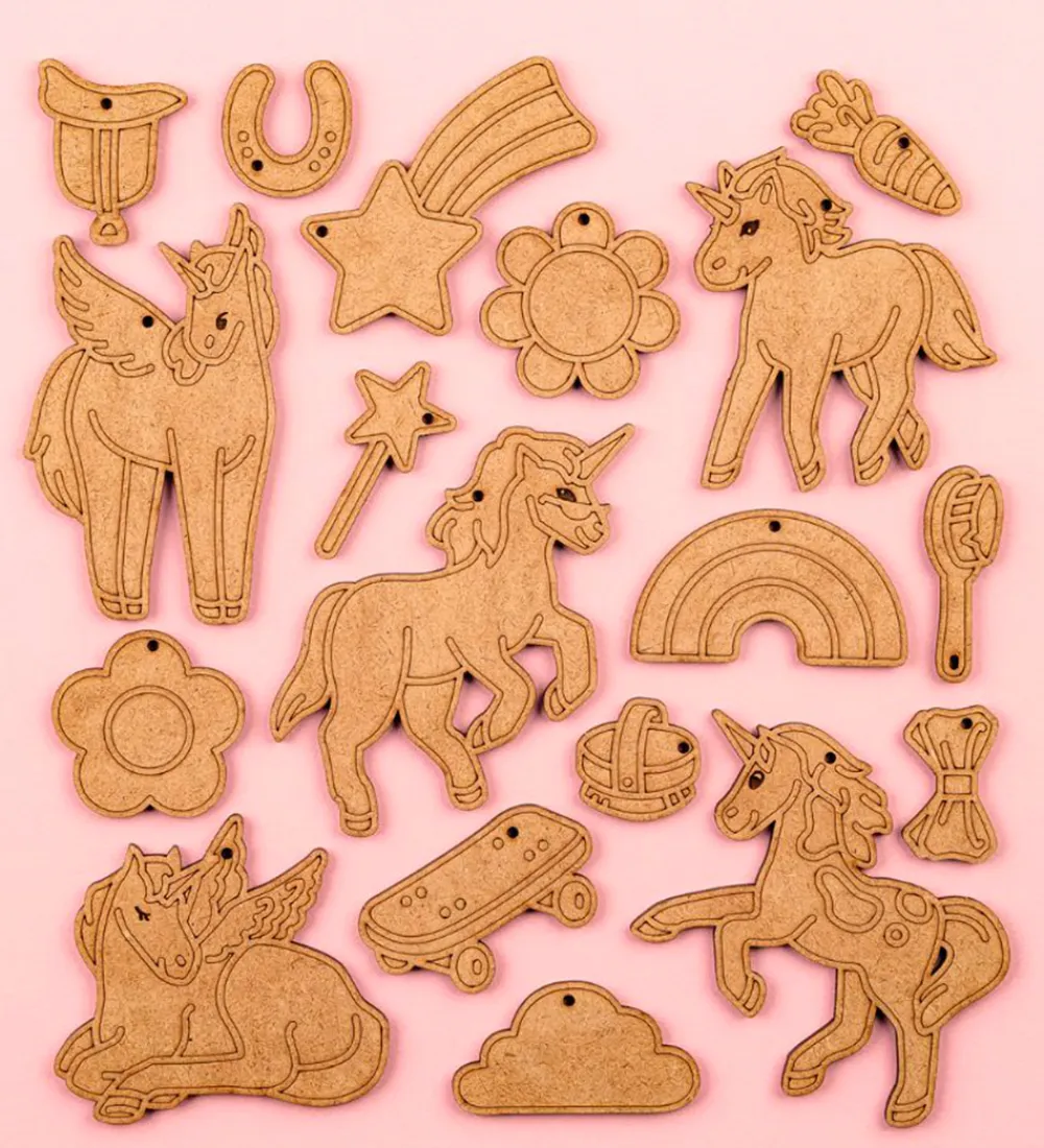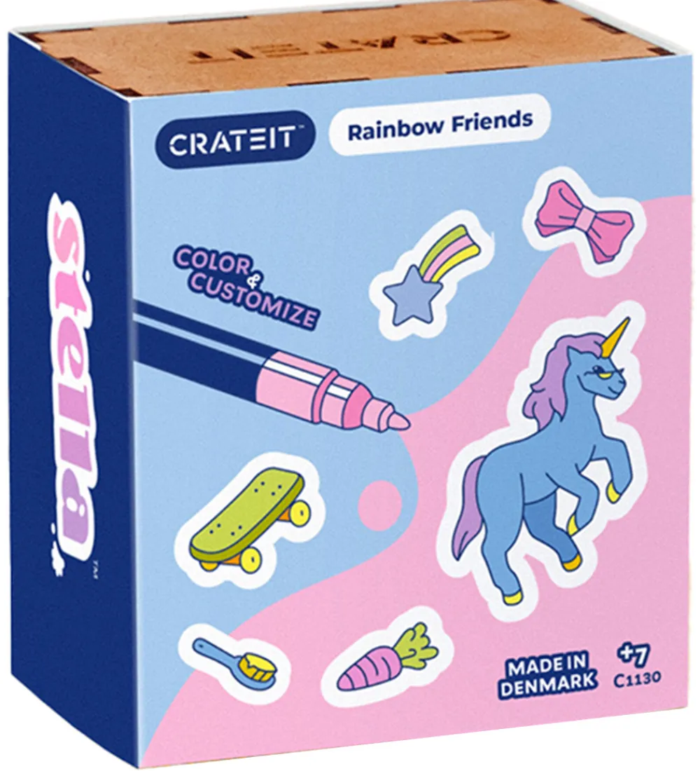 Hyggeligt Crateit kreatsæt i form af fine figurer af HDF-træplader i et regnbuevenner-tema.