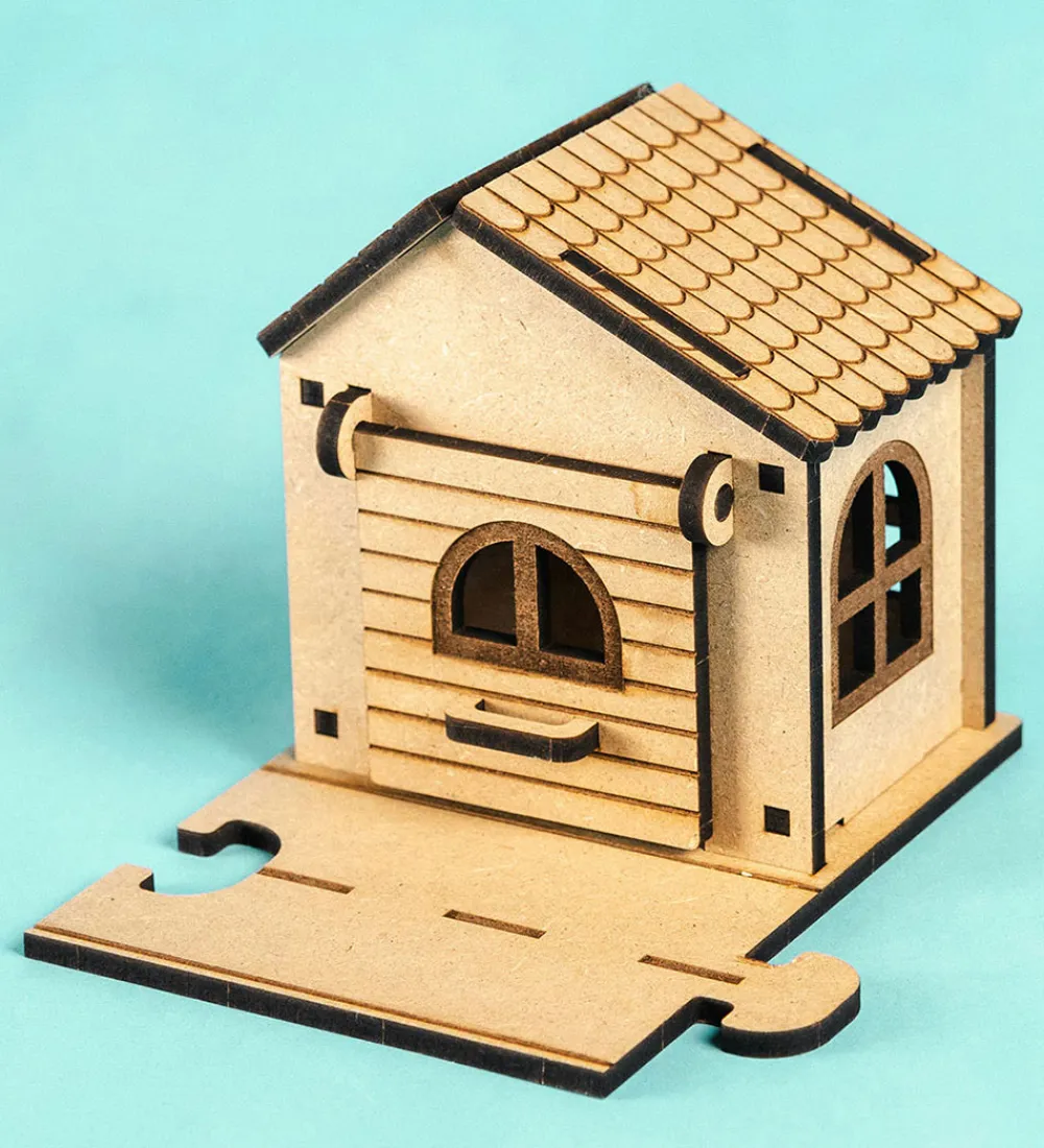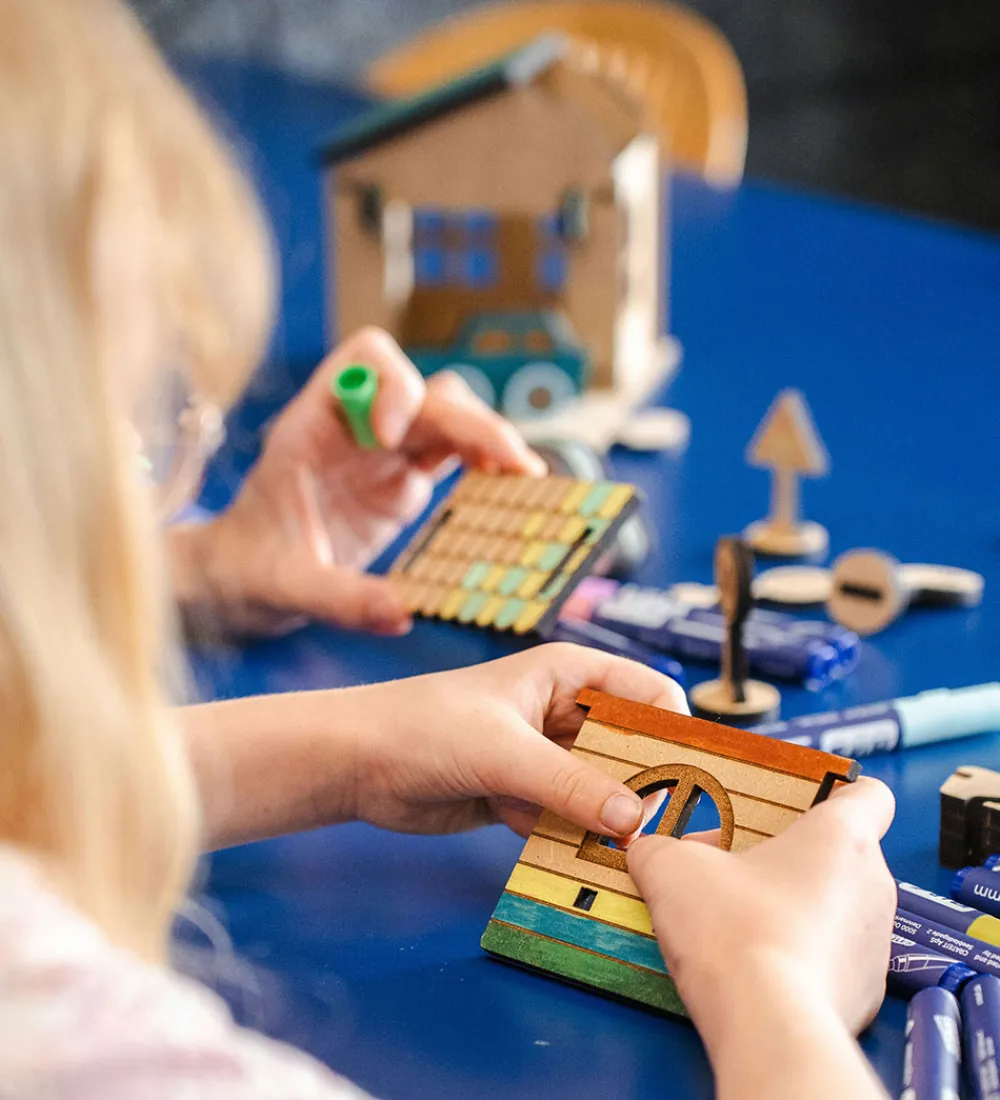 Med Crateit sættet kan du bygge din egen garage. Træet i sættet kommer ufarvet og man skal derfor selv farvelægge det. Det kan farves med alle typer af tusser, maling eller farveblyanter.