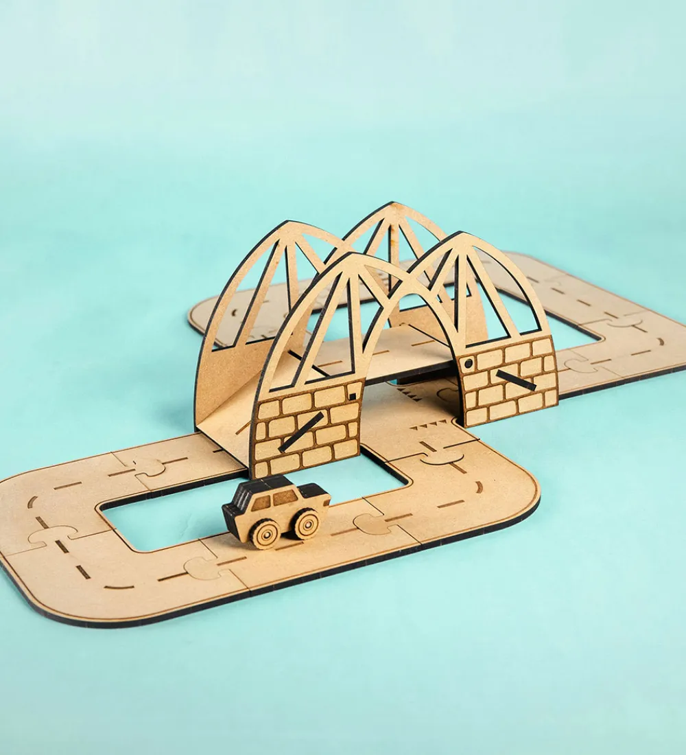 Med Crateit sættet kan du bygge din egen vej og hængebro, samt er træet ufarvet og du skal derfor selv farvelægge det. Det kan farves med alle typer af tusser, maling eller farveblyanter.