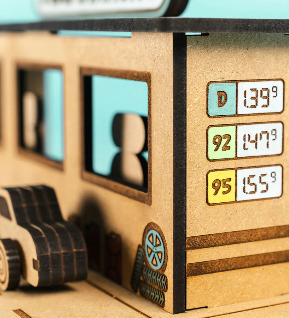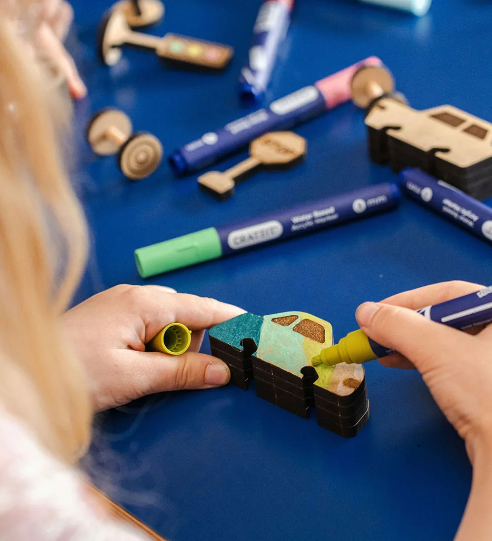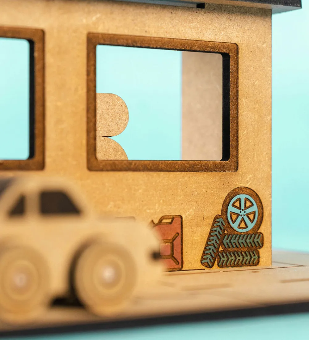 Med Crateit sættet kan du bygge din egen vej der fører til en tankstation, samt er træet ufarvet og du skal derfor selv farvelægge det. Det kan farves med alle typer af tusser, maling eller farveblyanter.