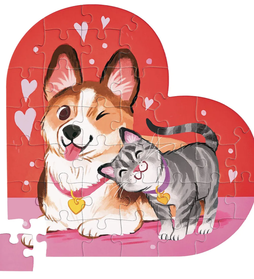 Flot Crocodile Creek gulvpuslespil med form som et hjerte og motiv af en hund og en kat, der kærlig knuger sig til hinanden.