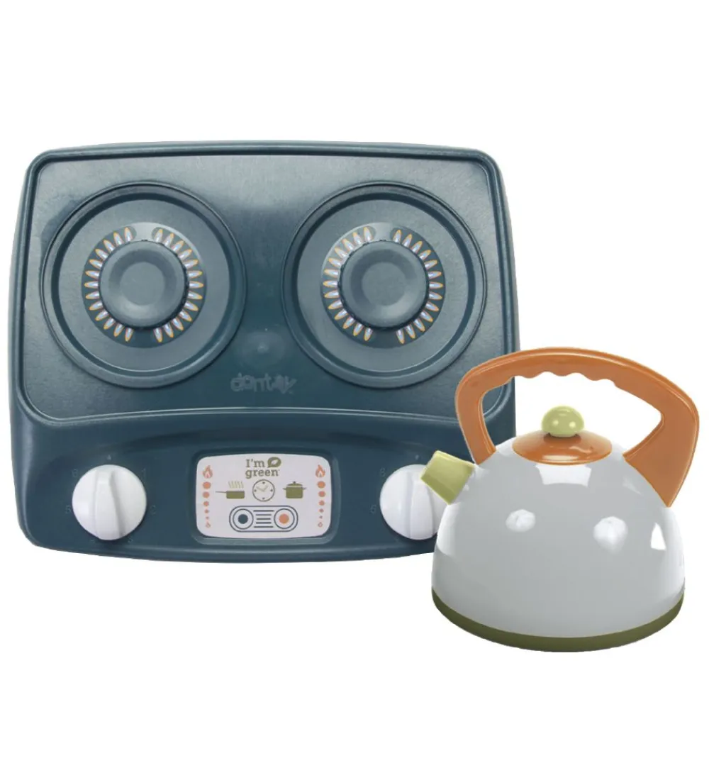 Dantoy kogepladen har har to plader med klistermærker, der ligner flammer fra et gaskomfur. Fortil sidder der to knapper, som man kan dreje på. Kedlen har et håndtag og en lille tud, og låget i toppen kan tages af.