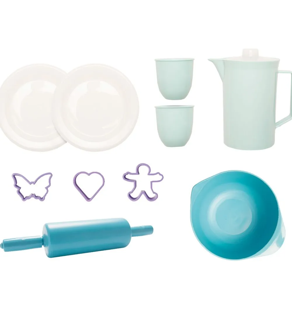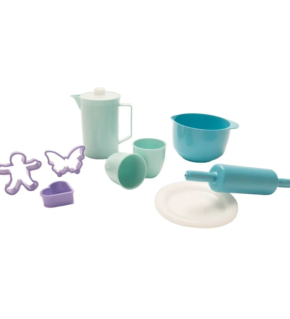 Sjovt Dantoy kaffe og bagesæt med 10 dele, i blå, grøn, hvid og lilla.
