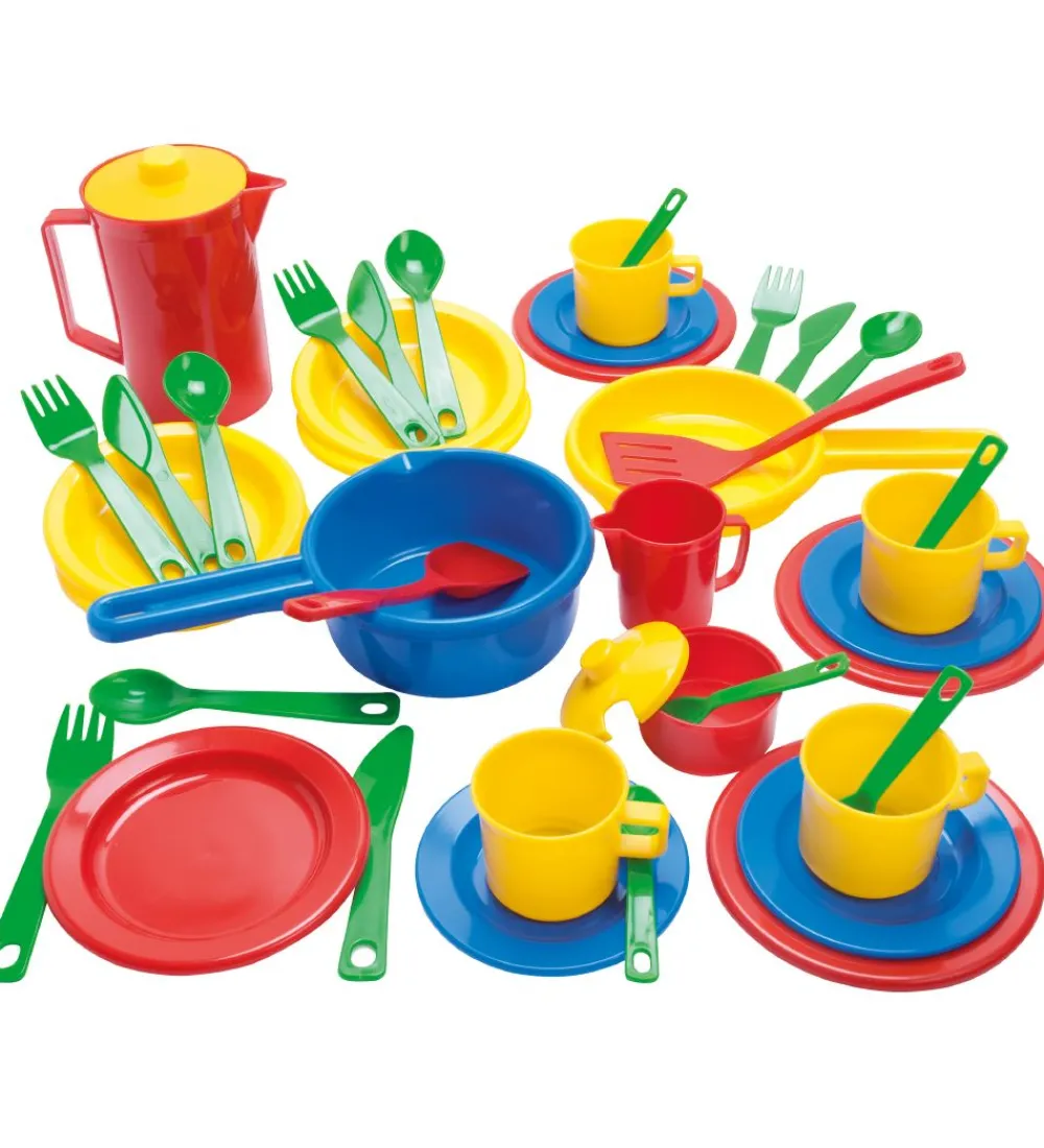 Dantoy køkkensættet består af hele 42 dele, og indeholder alt fra bestik til gryder til sukkerbøtte.