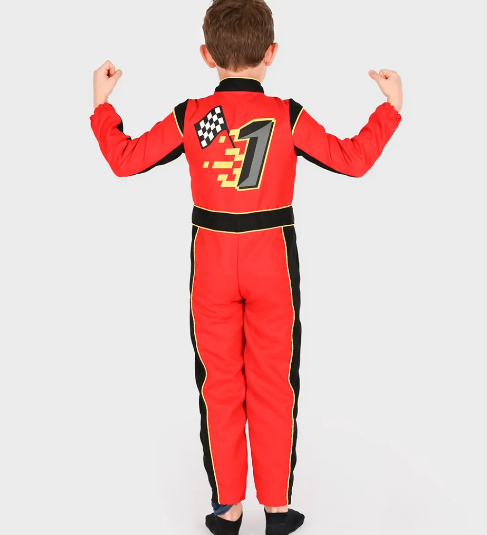 Sej Den Goda Fen udklædning i form af en racerkører-dragt i rød med detaljer i sort og gul. Fortil er der sorte og hvide tern henover brystet og et print af et 1-tal på venstre bryst. På ryggen er der et stort print af et 1-tal og et målflag.