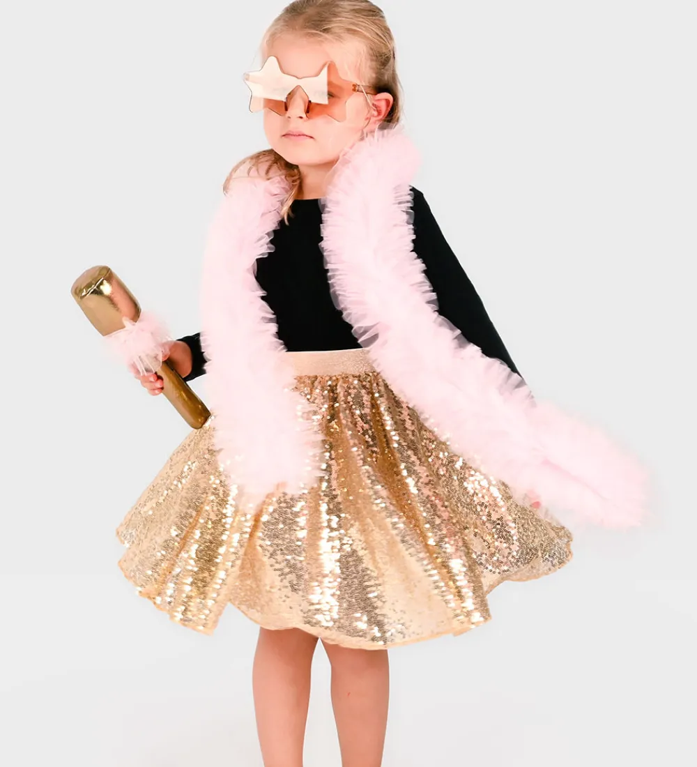 Flot Den Goda Fen udklædning i form af en disko-nederdel med guldfarvet palietter. Til nederdelen medfølger en lyserosa fjerboa, pink stjerneformede solbriller og en sølvfarvet mikrofon.