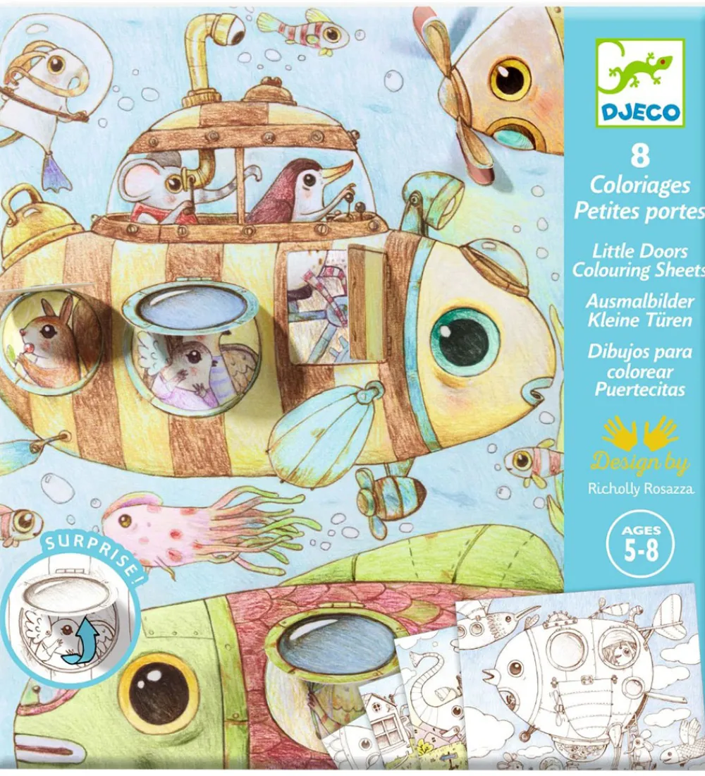Sød Djeco malebog med små døre. Malebogen består af 4 forskellige ark med flotte, hemmelige motiver af dyr.