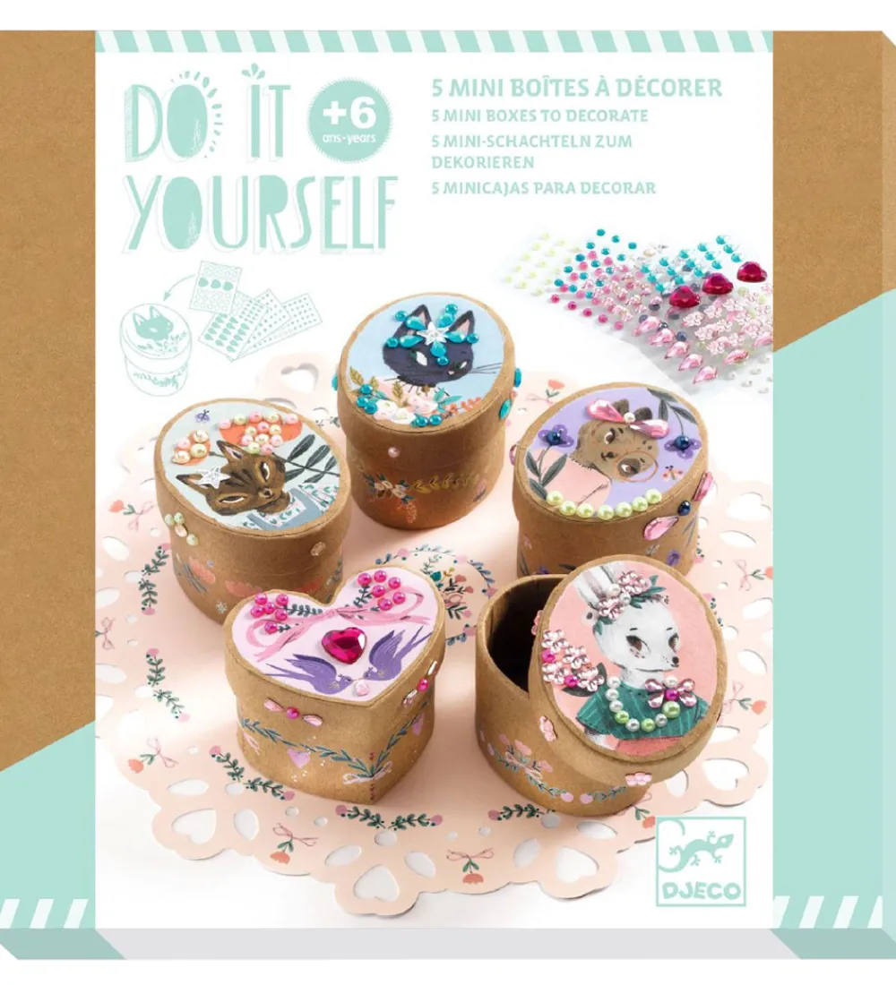 Djeco kreasættet består af alt det nødvendige til at gøre de flotte mini æsker personlige, så de kan designes ligesom man har lyst. Sættet er med til at styrke barnets kreativitet og finmotorik.