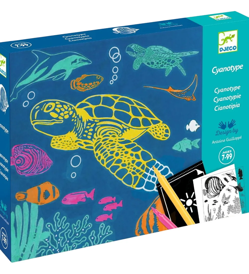 Djeco farvesættet indeholder uigennemsigtige motiver, som man kan overføre til lysfølsomt papir. Når papiret udsættes for sollys, dannes der et negativ af motiverne. Derefter skylles papiret i koldt vand, hvor dekorationerne træder frem på en blå baggrund.
