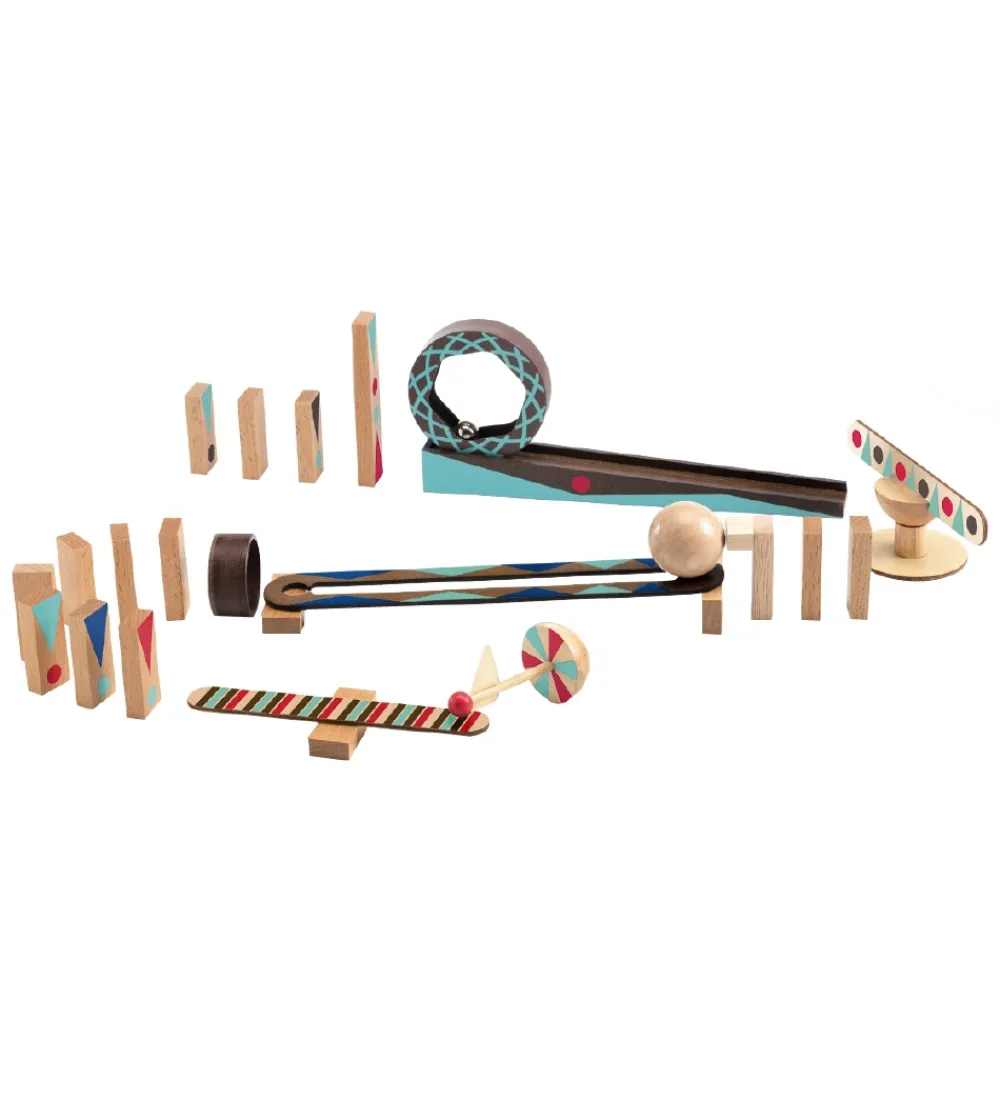Djeco kuglebanen består af 28 dele, som kan sættes sammen på et utal af måder. Spillet indbyder til mange timers sjov og opfindsomhed med at konstruere en bane og se, hvordan der bliver skabt en kædereaktion.