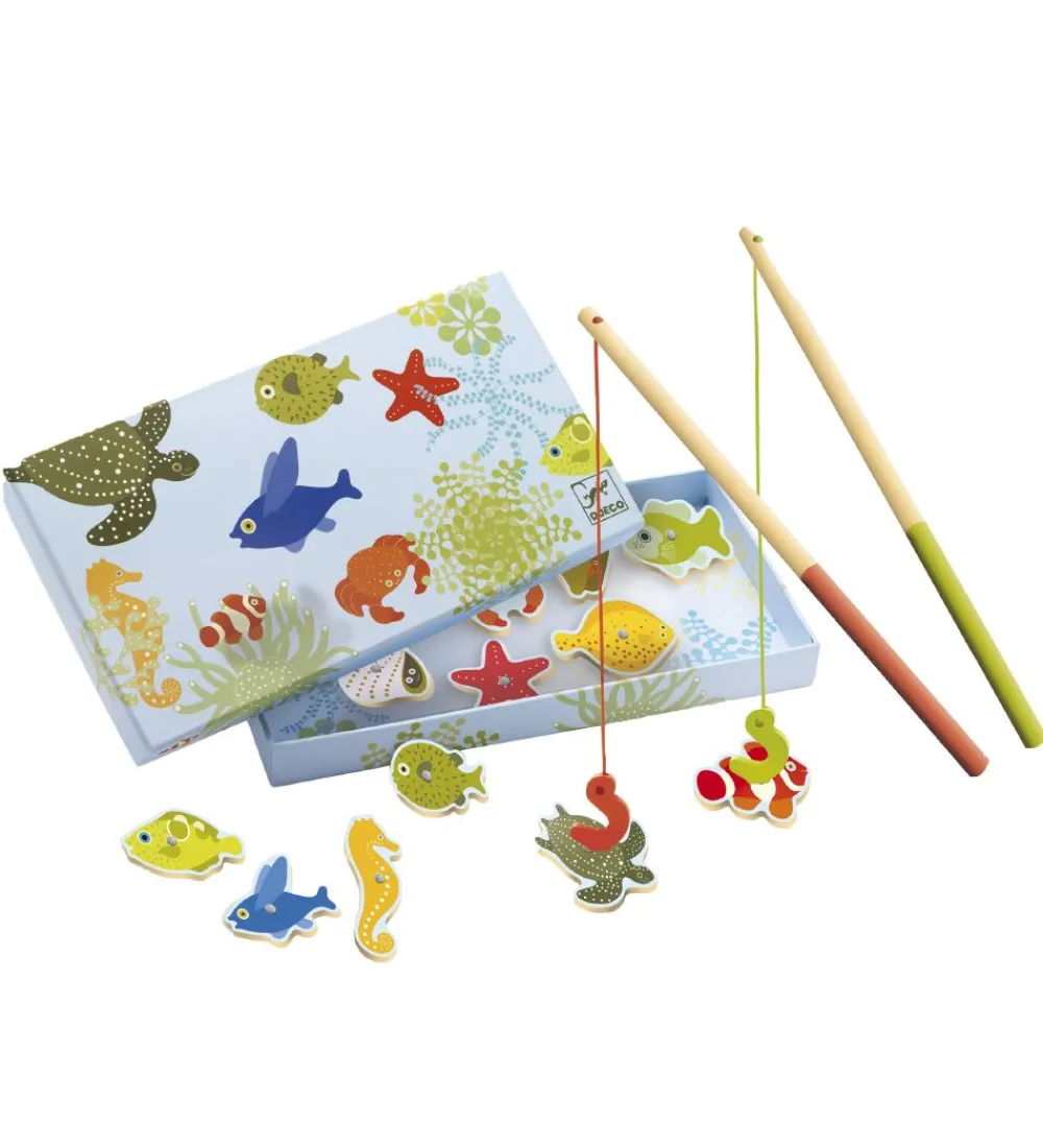 Djeco fiskespillet består af 12 havdy af træ med en lille magnet, som skal fiskes op af æsken med en af de to fiskestænger med en magnet på fiskekrogen.