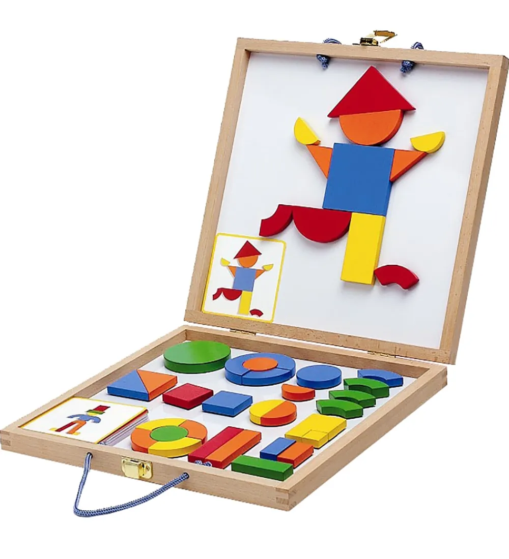 Djeco magneterne kommer i en praktisk trækuffert, og når den er slået, kan magneterne sættes fast på indersiden af den. Der medfølger nogle kort med motiver med forskellige figurer, som man kan prøve at lave med magneterne.