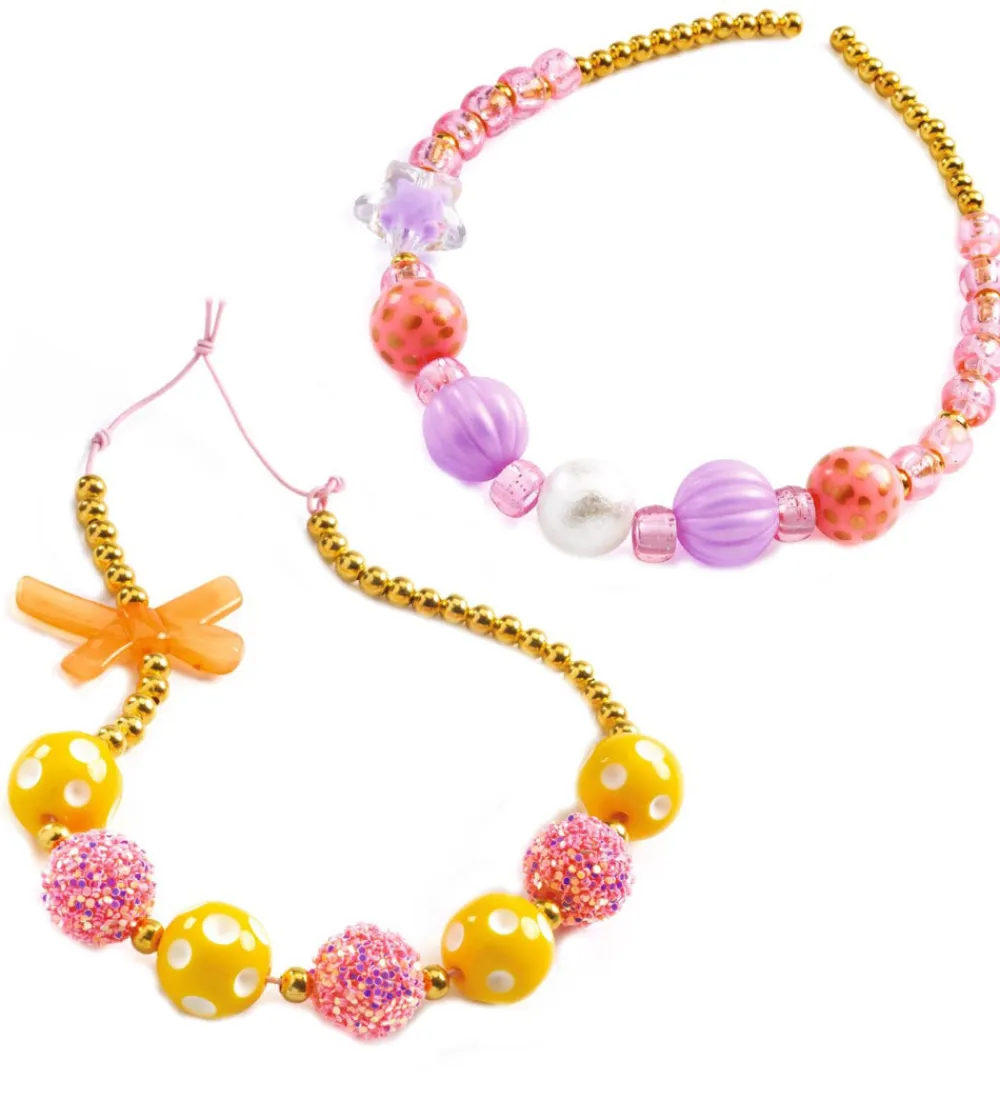 Djeco sættet består af flere end 200 perler samt elastiksnore og små, guldfarvede vedhæng, så børn kan lave deres egne halskæder og armbånd i massevis.