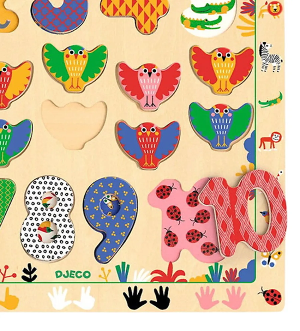 Farverigt Djeco puslespil af træ med tallene 1-10 samt fine ugler.