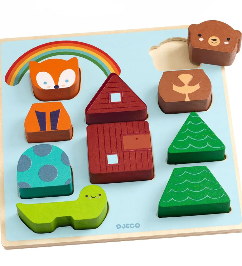 Djeco puslepillet består af ti brikker og en firkantet plade med fordybninger, som brikkerne passer ned i. Hver brik stikker op over kanten af pladen, så det er let for det lille barn at gribe fat om brikkere. Brikkerne kan også stables på hinanden, så de små kan lege på forskellige måder.