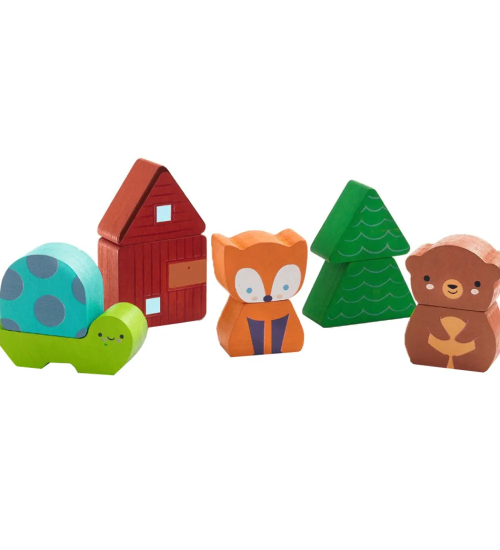Sjovt Djeco puslepil af træ, med motiver af forskellige dyr, et hus og et træ.