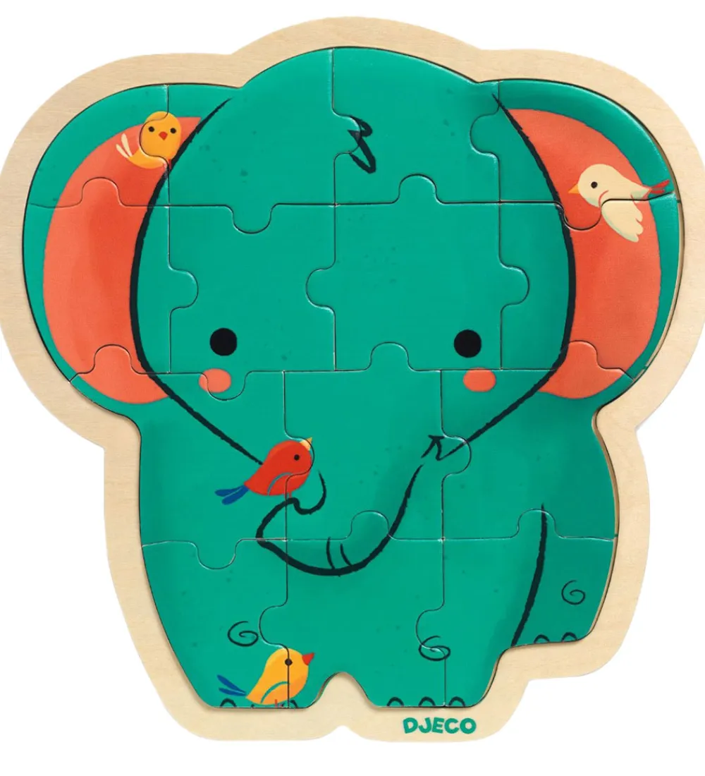 Sjovt Djeco puslespil i træ, med motiv af en sød elefant, med fugle siddende rundt omkring.
