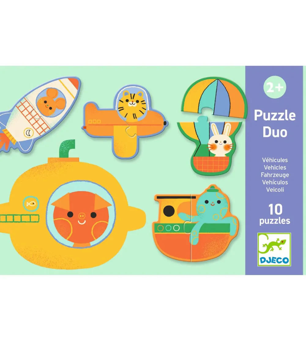Skønt Djeco puslespil med søde dyremotiver og forskellige køretøjer. Puslespillet består af 10 forskellige puslespil med to brikker i hvert. Puslespillene styrker børns motoriske færdigheder og fantasi, mens de lærer om transportmidler.
