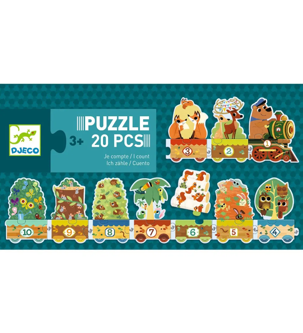 Djeco puslespillet er aflangt og består af 20 brikker, som skal ligges i den rigtige rækkefølge. Når brikkerne ligger i den rigtige rækkefølge, vil brikkerne vise tallene 1-10. Herved kan de små børn også øve sig på tallene.