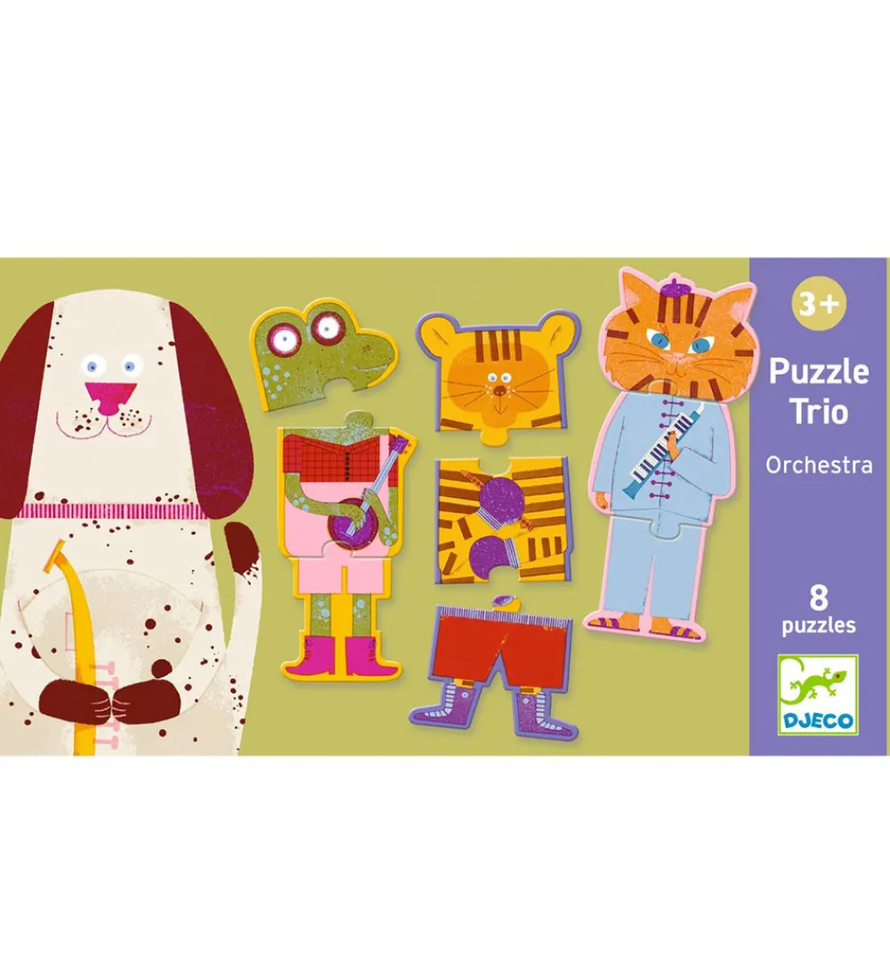 Underholdende Djeco puslespil med motiver af sjove dyr. Det inderholder 8 forskellige puslespil med 3 brikker i hvert. Puslespilsbrikkerne sættes sammen, så der dannes en figur.