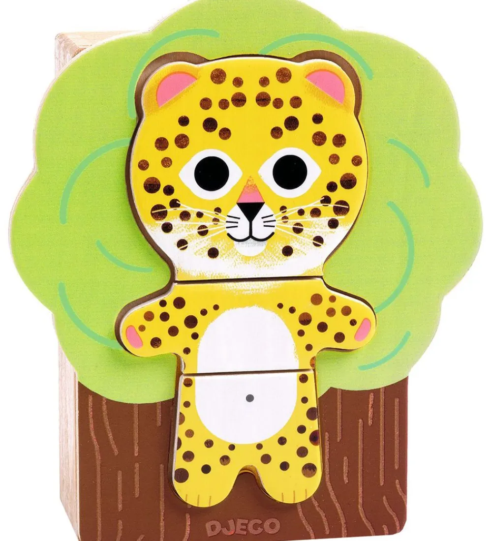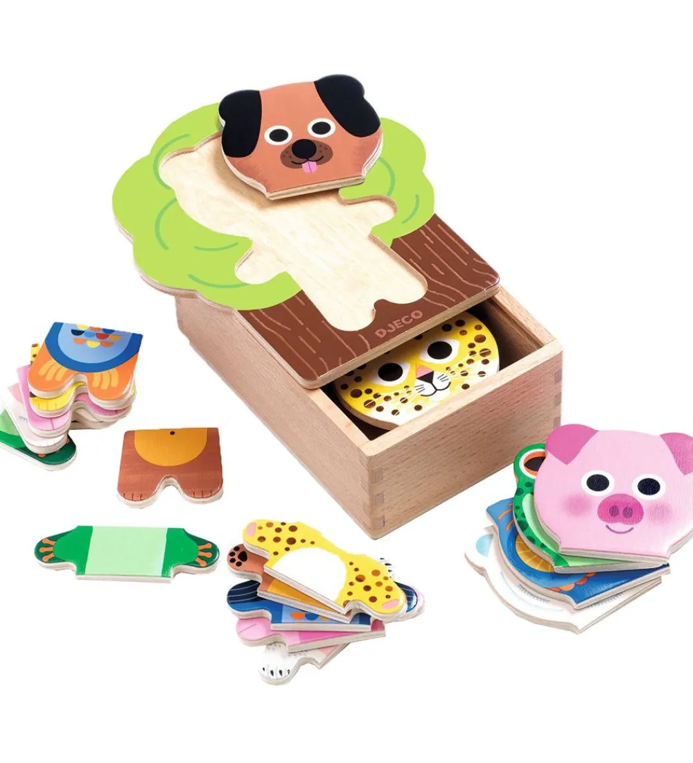 Djeco puslespillet består af en æske med et aftageligt låg, som er træet hvor dyrene skal samles i. Spillet har 6 dyr af 3 brikker, og brikkerne kan opbevares i æsken, når de ikke bruges.