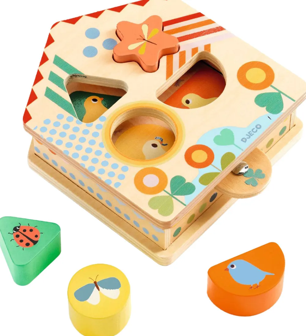 Sjov Djeco puttekasse af træ, med form som et hus med et flot print af forskellige former og farver.