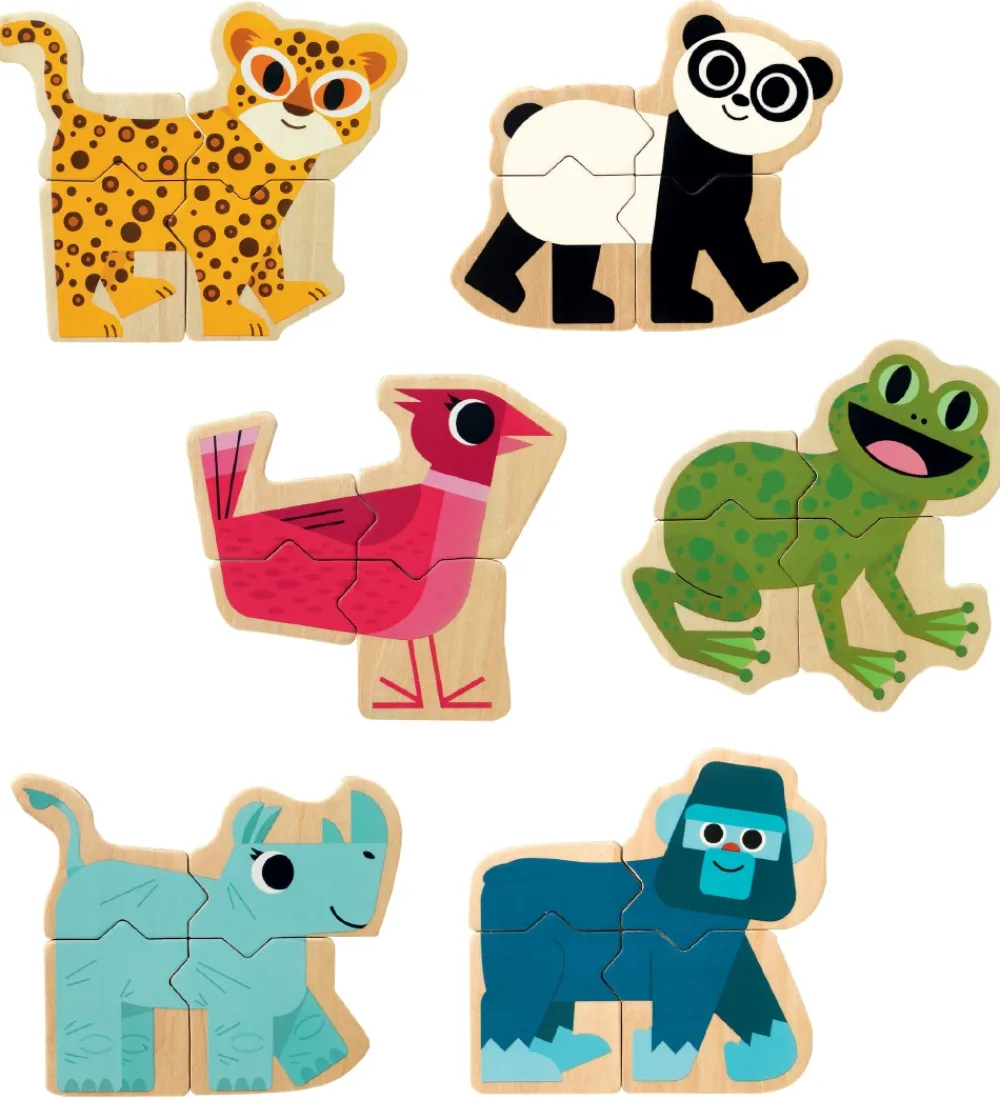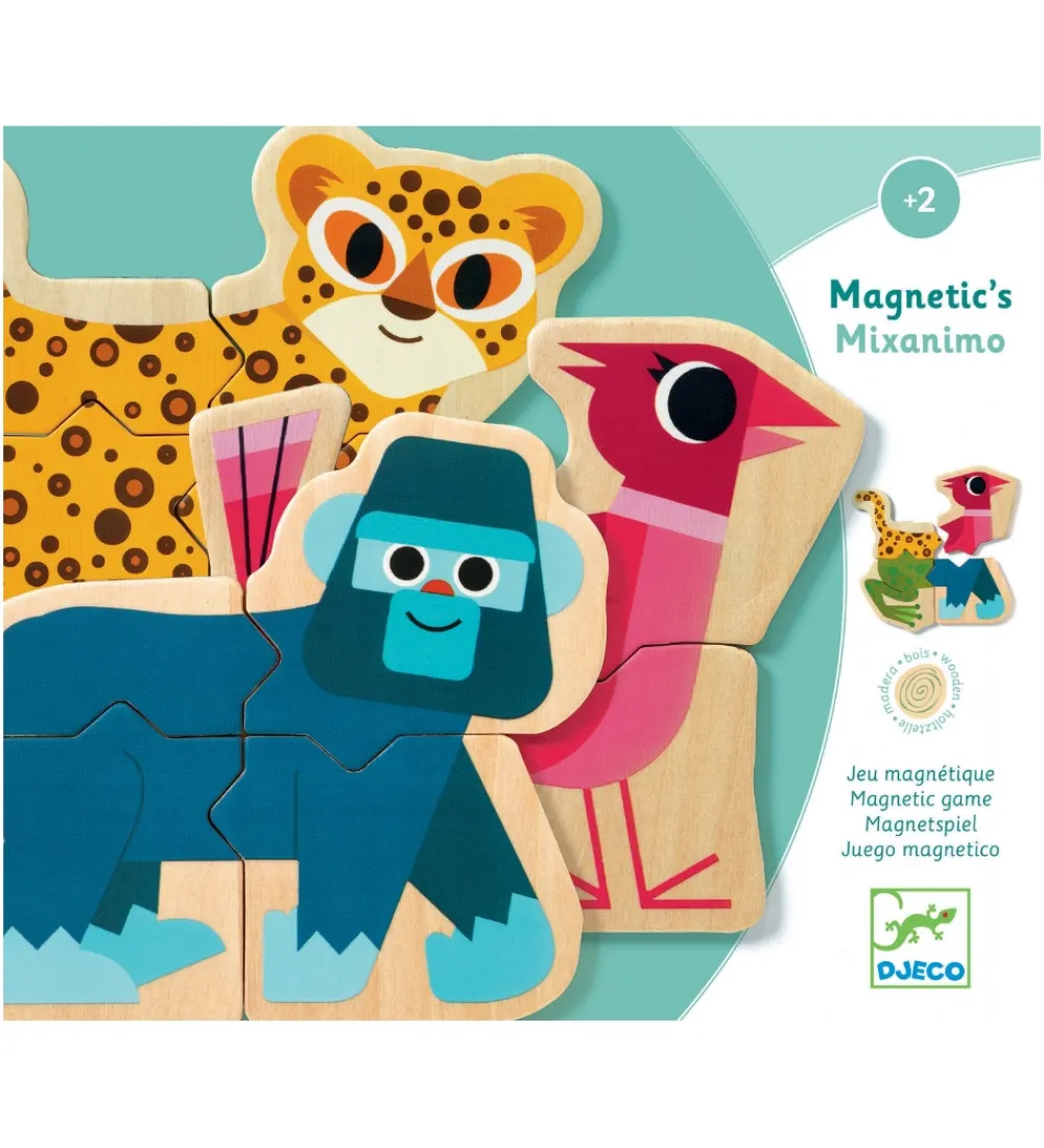 Djeco magnetpuslespillet består af i alt 24 brikker med motiverne af forskellige dyr, blandt andet en frø og en panda. Brikkerne har de samme former i de sider, der sidder sammen, så man kan sætte dele fra forskellige dyr sammen. Hver brik er magnetisk, så de kan sættes op på en magnetisk tavle eller køleskabet.