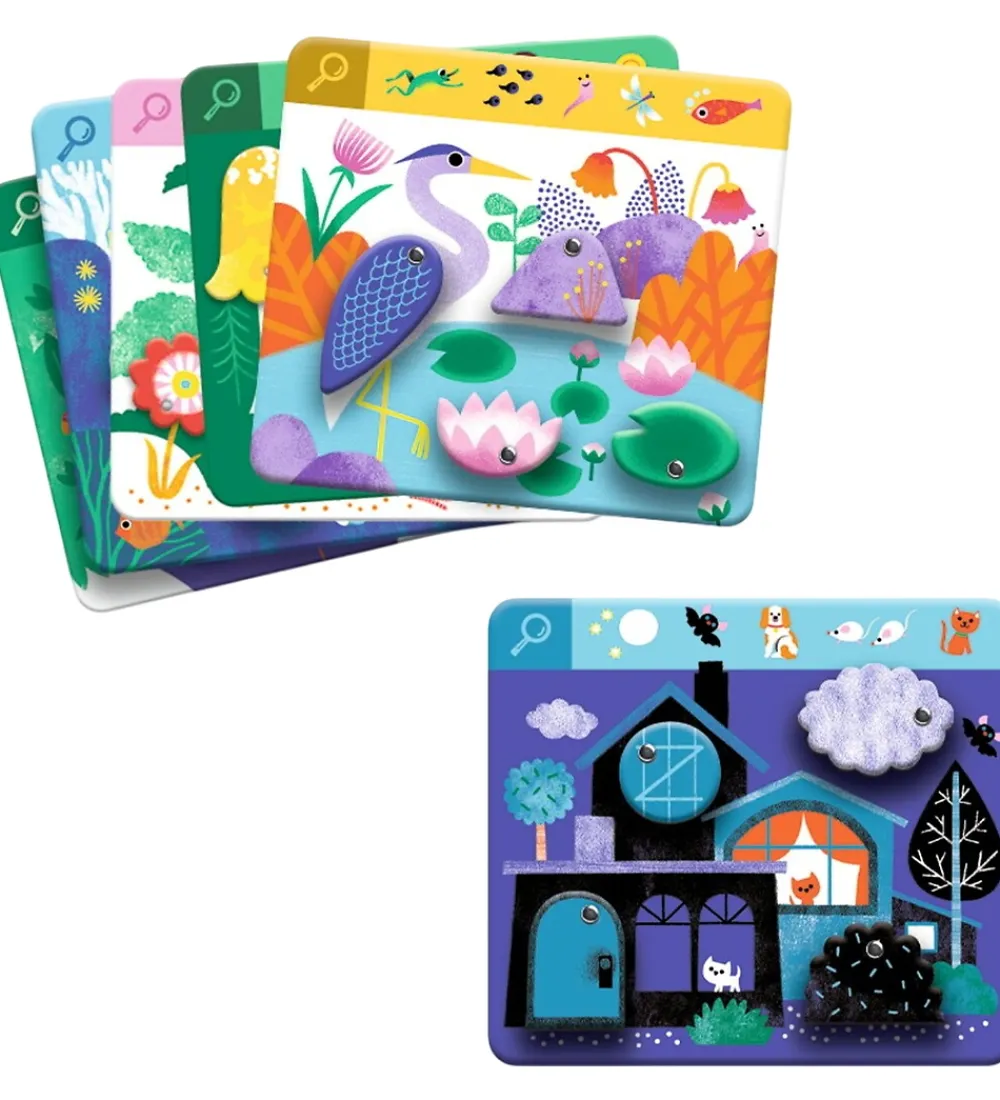 Djeco spillet består af 6 kort med forskllige motiver i klare farver og med masser af detaljer. Her gælder det om at gøre sig umage med at finde de skjulte motiver bag brikkerne, som kan drejes til side.