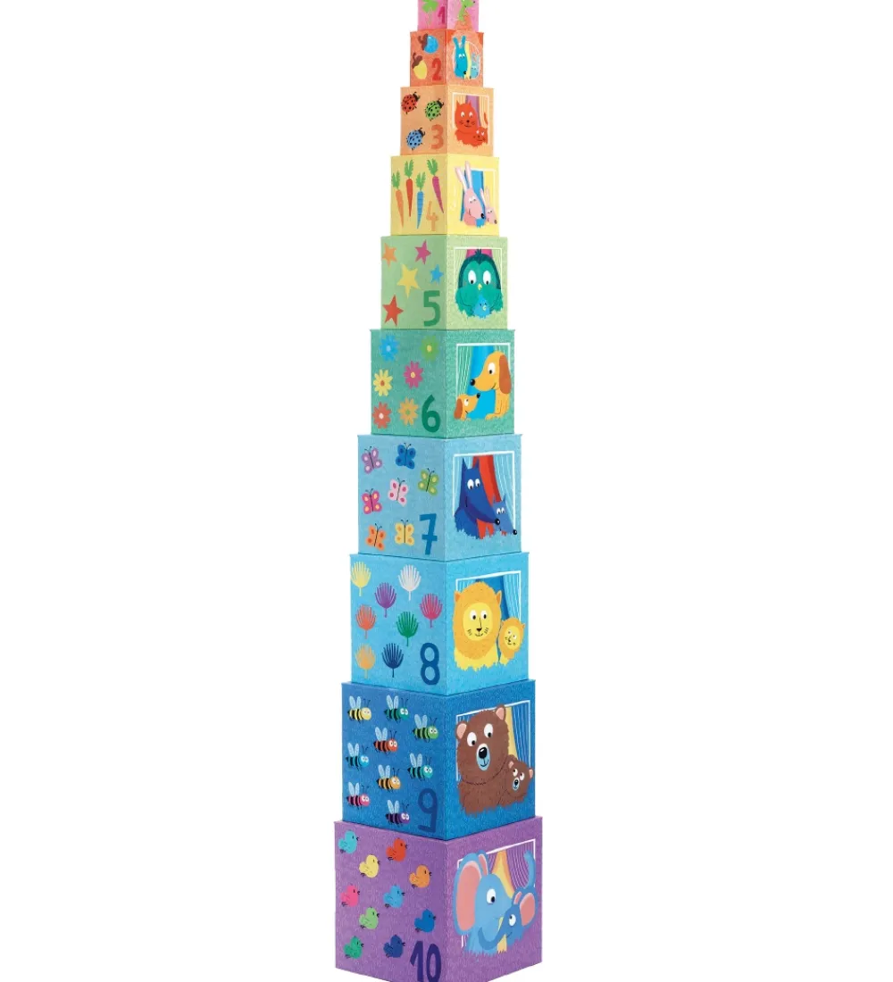 Spændende Djeco stabelklodser bestående af 10 klodser, med forskellige print og mønstre i et regnbue tema.