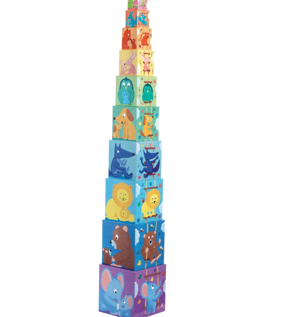 Djeco stablelegetøjet består af 10 separate klodser, alle med et motiv. Sortering og stabling er en naturlig del af barnets udvikling, hvilket klodserne er med til at udvikle. Klodserne er i hårdt pap og de kan alle pakkes sammen i den største klods, så de er lette at transportere.
